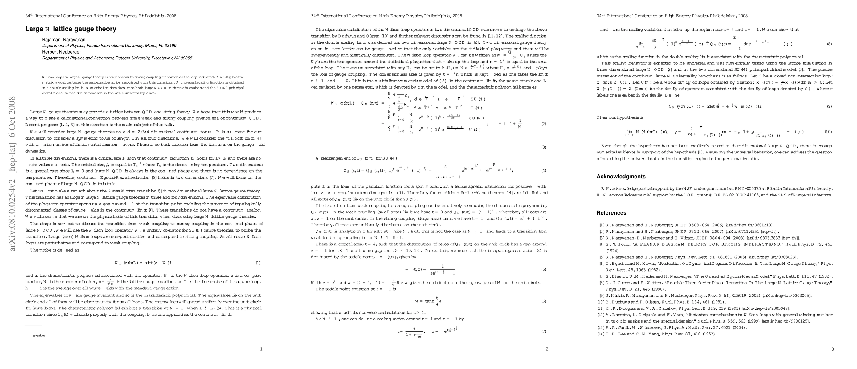 This research explores large N lattice gauge theory, revealing a transition from weak to strong coupling in Wilson loops when dilated. A matrix model captures this transition's universal behavior, and numerical studies indicate that both 3D large N QCD and 2D SU(N) principal chiral model share the same universality class.