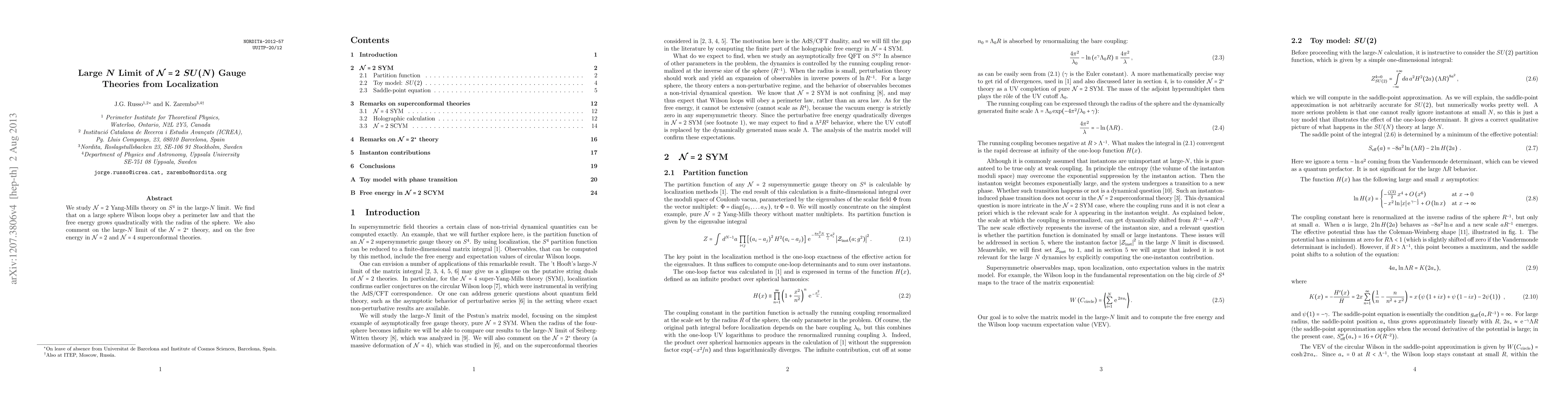 This paper investigates N=2 Yang-Mills theory on S^4 in the large-N limit, revealing that Wilson loops follow a perimeter law and that the free energy scales quadratically with the sphere's radius. It also discusses the implications for the large-N limit of N=2* theory and compares free energies across N=2 and N=4 superconformal theories.