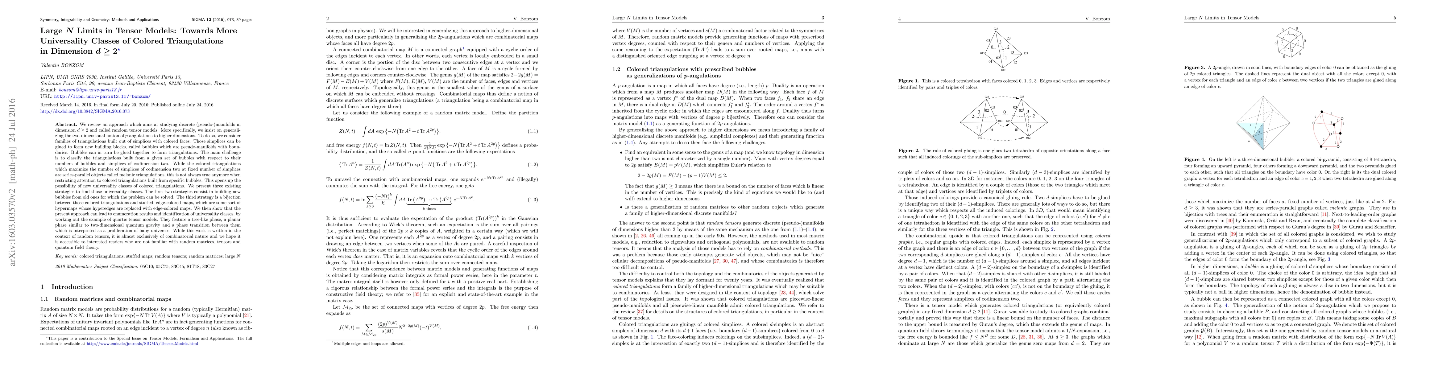 We review an approach which aims at studying discrete (pseudo-)manifolds in dimension $d\geq 2$ and called random tensor models. More specifically, we insist on generalizing the two-dimensional notion of $p$-angulations to higher dimensions. To do so, we consider families of triangulations built out of simplices with colored faces. Those simplices can be glued to form new building blocks, called bubbles which are pseudo-manifolds with boundaries. Bubbles can in turn be glued together to form triangulations. The main challenge is to classify the triangulations built from a given set of bubbles with respect to their numbers of bubbles and simplices of codimension two. While the colored triangulations which maximize the number of simplices of codimension two at fixed number of simplices are series-parallel objects called melonic triangulations, this is not always true anymore when restricting attention to colored triangulations built from specific bubbles. This opens up the possibility of new universality classes of colored triangulations. We present three existing strategies to find those universality classes. The first two strategies consist in building new bubbles from old ones for which the problem can be solved. The third strategy is a bijection between those colored triangulations and stuffed, edge-colored maps, which are some sort of hypermaps whose hyperedges are replaced with edge-colored maps. We then show that the present approach can lead to enumeration results and identification of universality classes, by working out the example of quartic tensor models. They feature a tree-like phase, a planar phase similar to two-dimensional quantum gravity and a phase transition between them which is interpreted as a proliferation of baby universes.