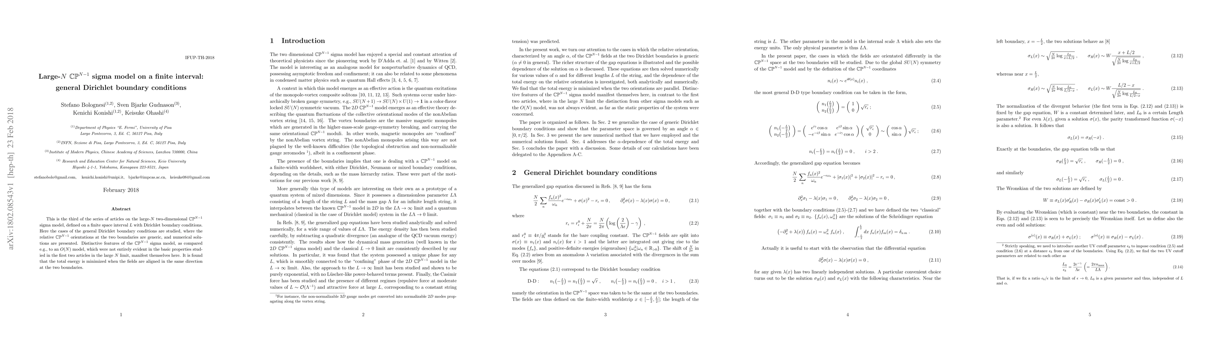 This paper explores the large-$N$ $\mathbb{CP}^{N-1}$ sigma model on a finite interval with general Dirichlet boundary conditions, revealing distinctive features compared to $O(N)$ models, and finds that the total energy is minimized when the fields align in the same direction at both boundaries. Numerical solutions illustrate these properties.