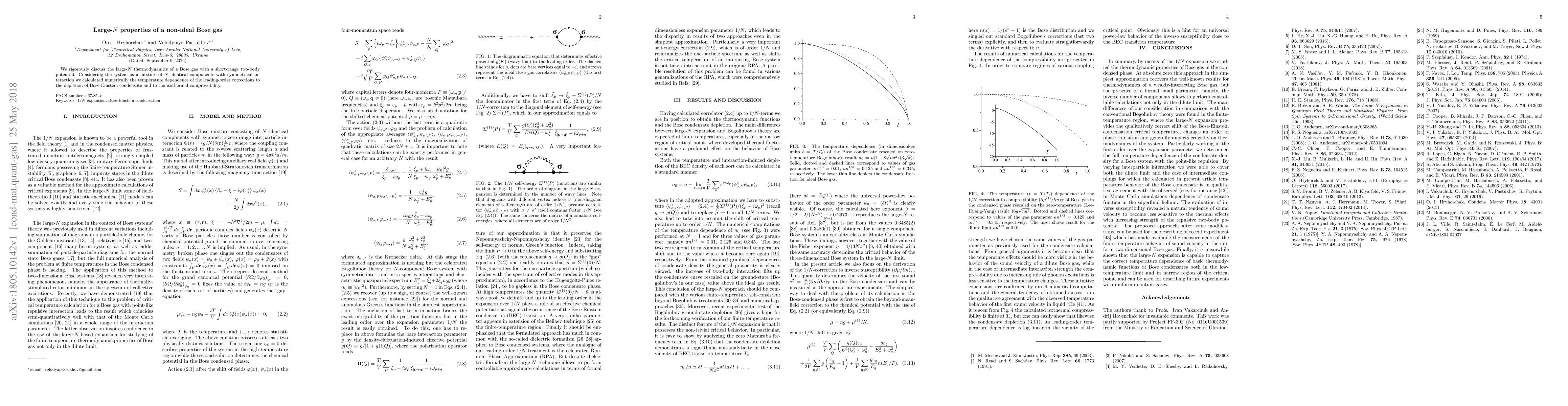 We rigorously discuss the large-$N$ thermodynamics of a Bose gas with a short-range two-body potential. Considering the system as a mixture of $N$ identical components with symmetrical interaction we calculated numerically the temperature dependence of the leading-order corrections to the depletion of Bose-Einstein condensate and to the isothermal compressibility.