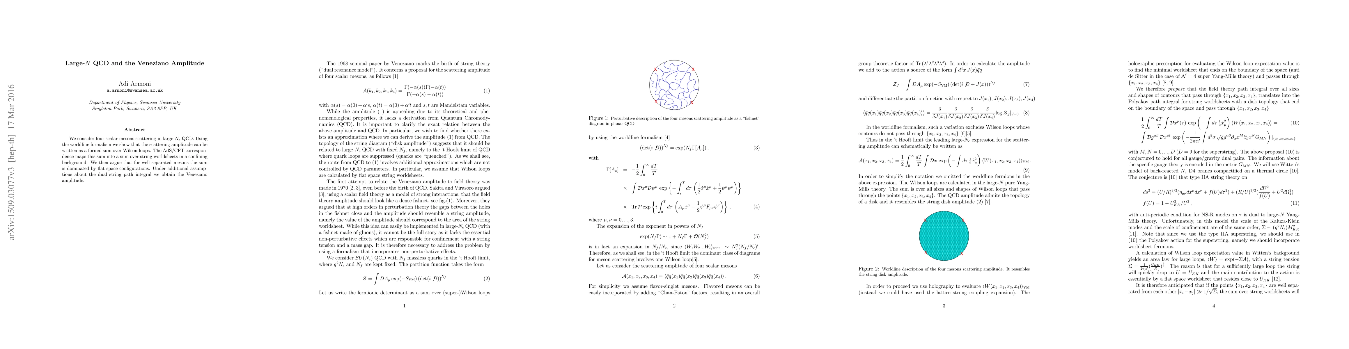 This research demonstrates that four scalar mesons' scattering in large-Nc QCD, via the worldline formalism, can be represented as a sum over Wilson loops. The AdS/CFT correspondence translates this into a sum over string worldsheets, leading to the Veneziano amplitude under specific assumptions.