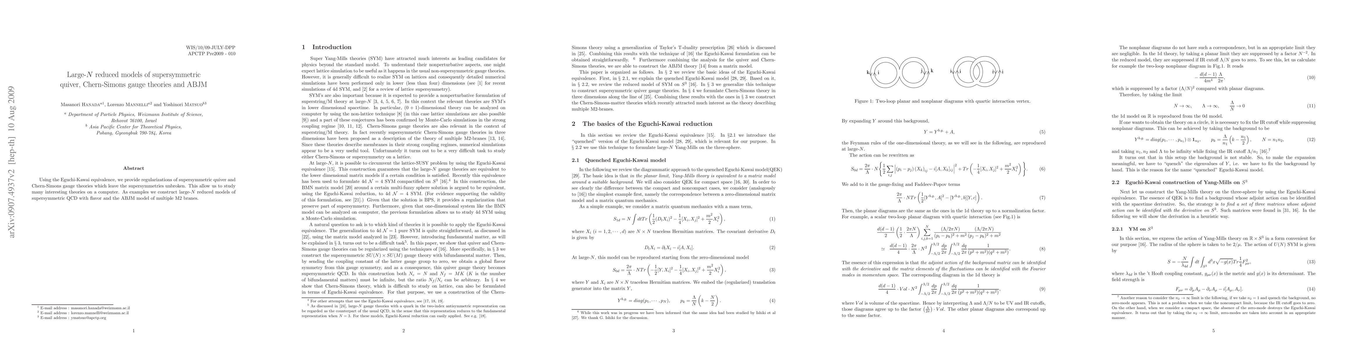 The paper develops regularizations for supersymmetric quiver and Chern-Simons gauge theories using the Eguchi-Kawai equivalence, preserving supersymmetry to study these theories computationally. It constructs large-$N$ reduced models for supersymmetric QCD with flavors and the ABJM model.