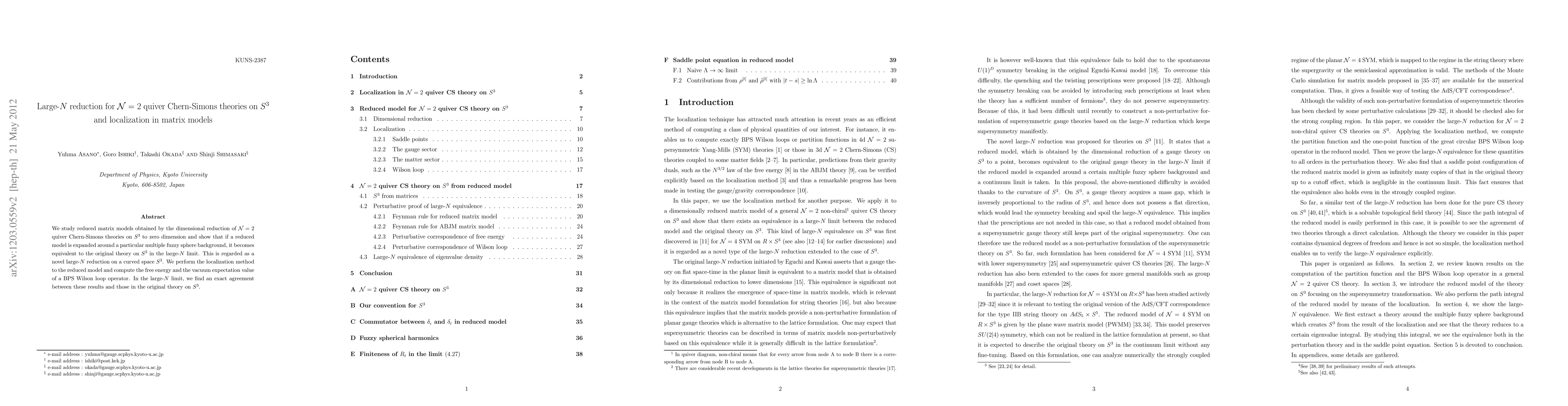 This paper investigates the large-N reduction of N=2 quiver Chern-Simons theories on S^3, demonstrating equivalence to the original theory in the large-N limit via a reduced matrix model. The localization method is applied to compute the free energy and BPS Wilson loop, showing exact agreement with the original S^3 theory results.