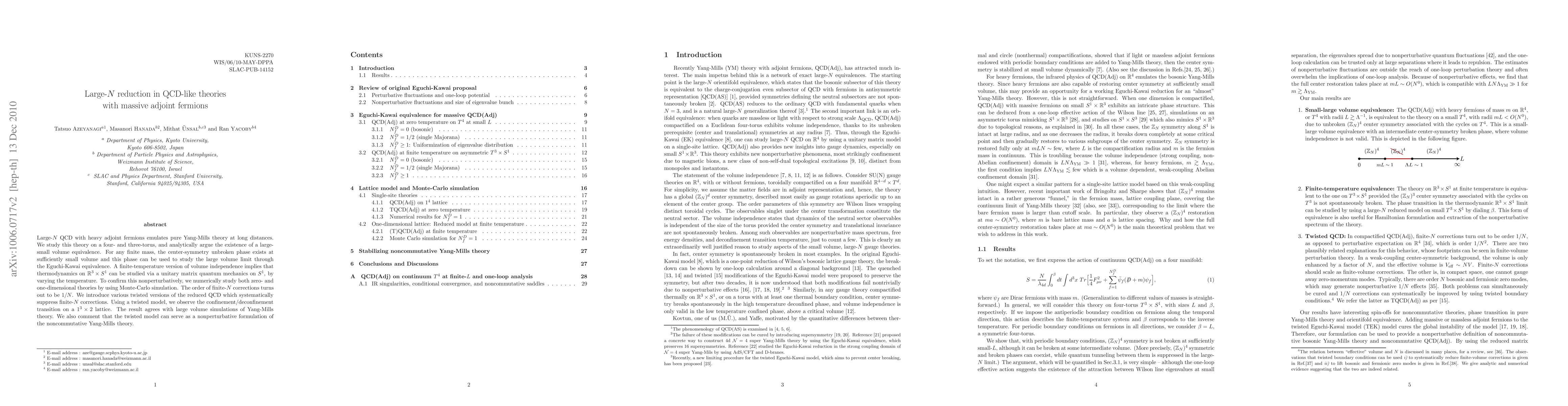 This paper investigates large-N QCD with massive adjoint fermions, demonstrating a large-small volume equivalence and confirming the Eguchi-Kawai reduction through numerical simulations. The study reveals a confinement/deconfinement transition and suggests a non-perturbative formulation of non-commutative Yang-Mills theory using a twisted model.