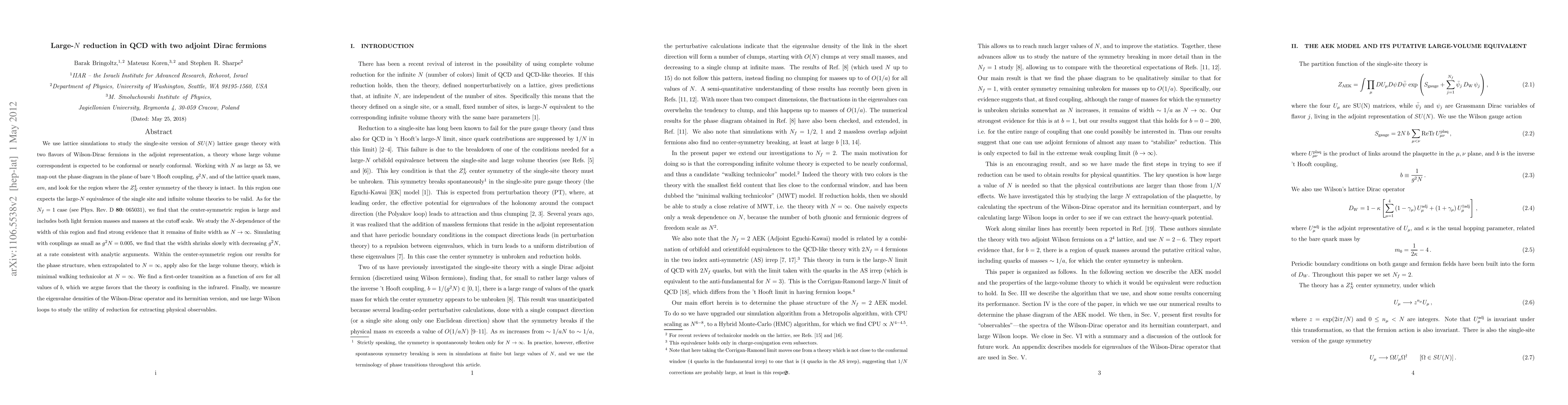 We use lattice simulations to study the single-site version of SU(N) lattice gauge theory with two flavors of Wilson-Dirac fermions in the adjoint representation, a theory whose large volume correspondent is expected to be conformal or nearly conformal. Working with N as large as 53, we map out the phase diagram in the plane of bare `t Hooft coupling, g^2 N, and of the lattice quark mass, a*m, and look for the region where the Z_N^4 center symmetry of the theory is intact. In this region one expects the large-N equivalence of the single site and infinite volume theories to be valid. As for the N_f=1 case (see Phys. Rev. D80: 065031), we find that the center-symmetric region is large and includes both light fermion masses and masses at the cutoff scale. We study the N-dependence of the width of this region and find strong evidence that it remains of finite width as N goes to infinity. Simulating with couplings as small as g^2 N = 0.005, we find that the width shrinks slowly with decreasing g^2 N, at a rate consistent with analytic arguments. Within the center-symmetric region our results for the phase structure, when extrapolated to infinite N, apply also for the large volume theory, which is minimal walking technicolor with N=infinity. We find a first-order transition as a function of a*m for all values of b, which we argue favors that the theory is confining in the infrared. Finally, we measure the eigenvalue densities of the Wilson-Dirac operator and its hermitian version, and use large Wilson loops to study the utility of reduction for extracting physical observables.
