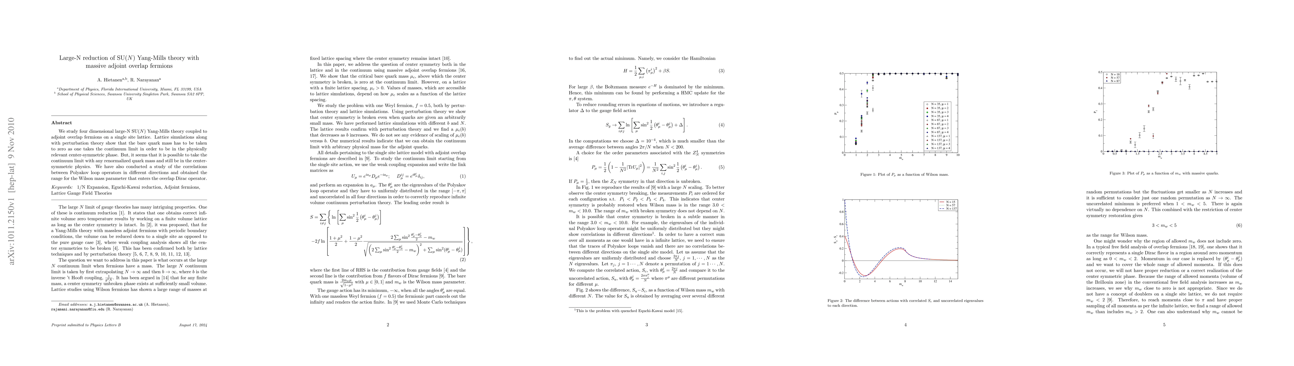 This paper investigates four-dimensional large-N SU(N) Yang-Mills theory with massive adjoint overlap fermions, finding that the continuum limit can be approached with any renormalized quark mass while maintaining the center-symmetric phase. The study also examines correlations between Polyakov loop operators and determines the range for the Wilson mass parameter in the overlap Dirac operator.