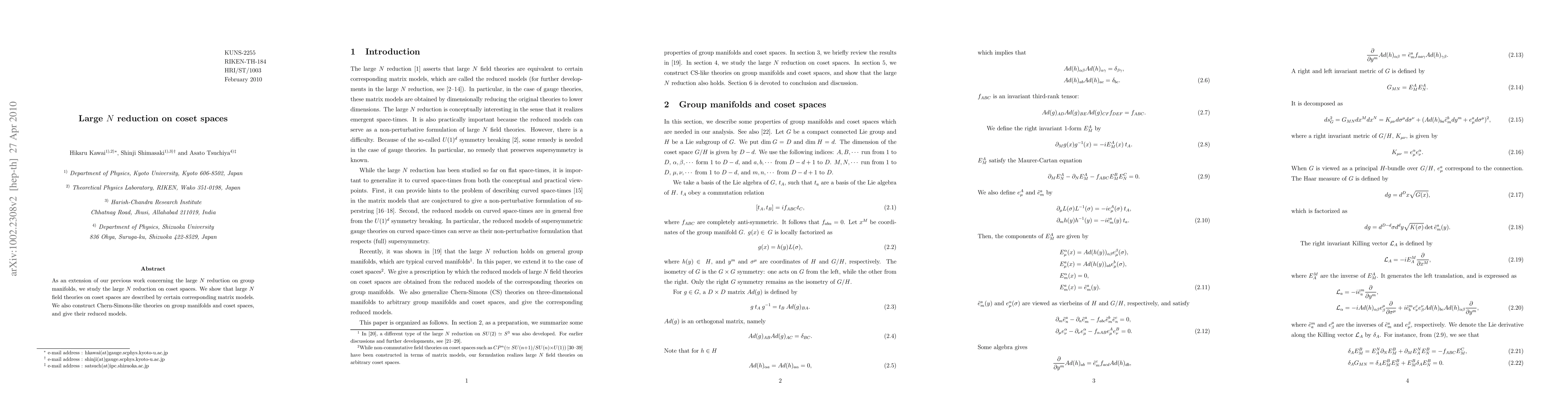 This paper extends previous research on large N reduction on group manifolds to coset spaces, demonstrating that large N field theories on coset spaces correspond to specific matrix models. It also constructs Chern-Simons-like theories on both group manifolds and coset spaces, providing their reduced models.
