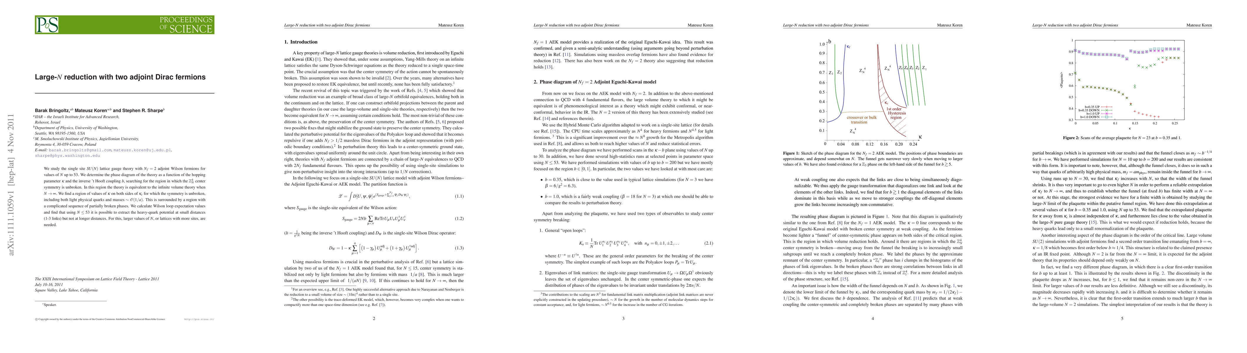 We study the single site SU(N) lattice gauge theory with N_f=2 adjoint Wilson fermions for values of N up to 53. We determine the phase diagram of the theory as a function of the hopping parameter kappa and the inverse 't Hooft coupling b, searching for the region in which the Z_N^4 center symmetry is unbroken. In this region the theory is equivalent to the infinite volume theory when N goes to infinity. We find a region of values of kappa on both sides of kappa_c for which the symmetry is unbroken, including both light physical quarks and masses ~O(1/a). This is surrounded by a region with a complicated sequence of partially broken phases. We calculate Wilson loop expectation values and find that using N <= 53 it is possible to extract the heavy-quark potential at small distances (1-3 links) but not at longer distances. For this, larger values of N, or lattices with more sites, are needed.