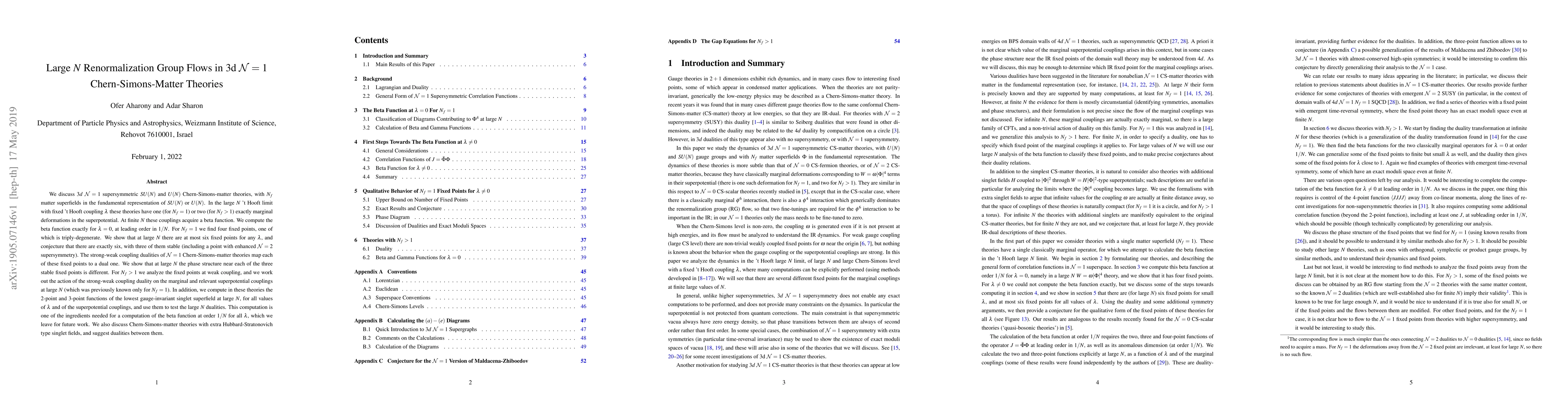 This paper studies 3d $\mathcal{N}=1$ supersymmetric Chern-Simons-matter theories in the large N limit, identifying fixed points and dualities, and computing beta functions and gauge-invariant superfield correlation functions to test large N dualities. It conjectures six fixed points for any $\lambda$ with three stable, including one with enhanced $\mathcal{N}=2$ supersymmetry.