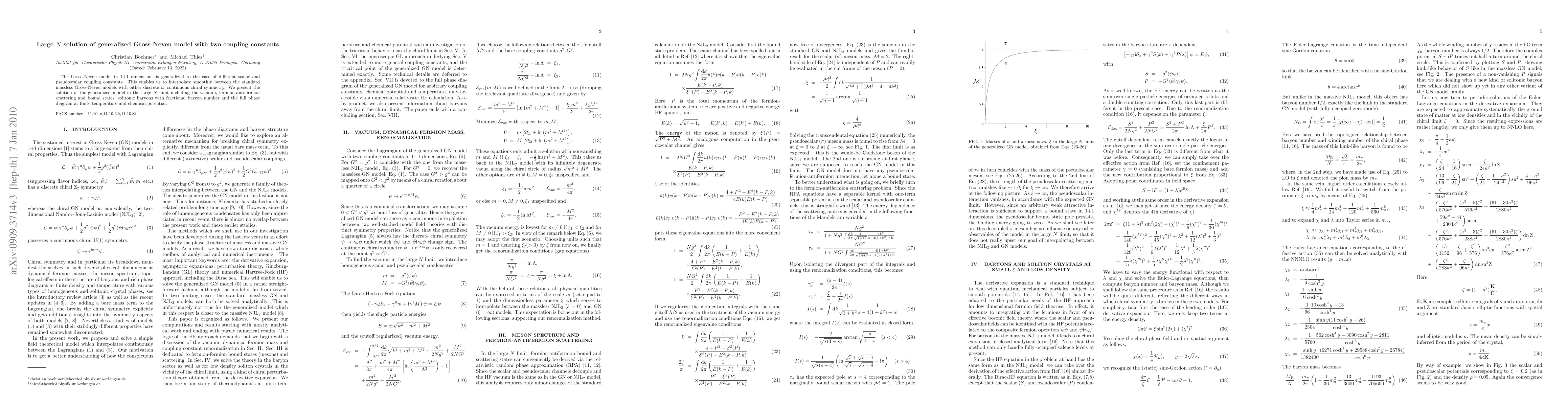 This paper presents a large N solution for a generalized Gross-Neveu model with distinct scalar and pseudoscalar coupling constants, exploring vacuum properties, fermion-antifermion scattering, bound states, solitonic baryons, and the full phase diagram at finite temperature and chemical potential.