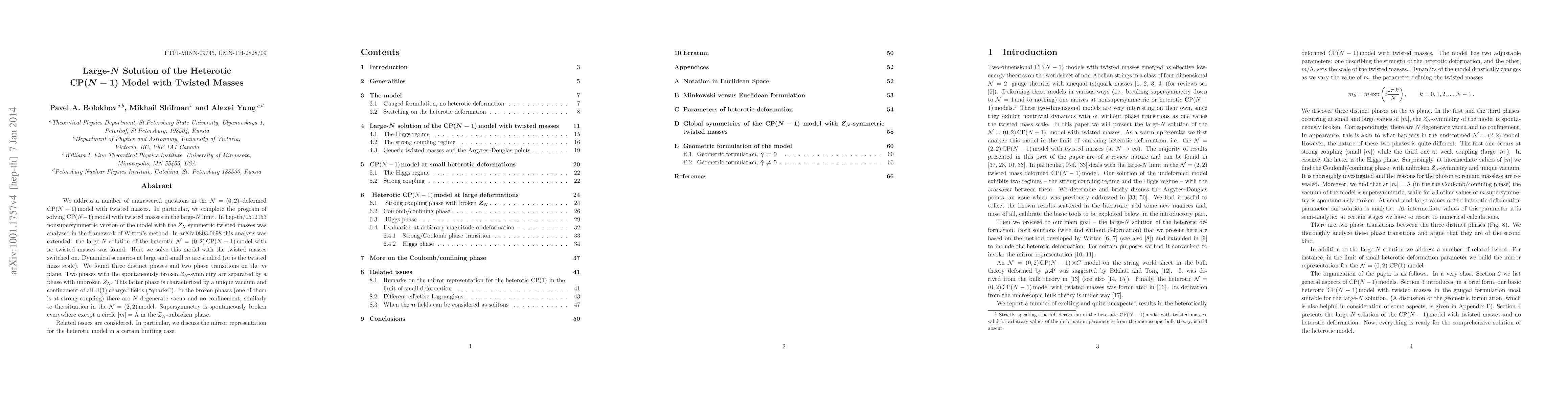 We address a number of unanswered questions in the N=(0,2)-deformed CP(N-1) model with twisted masses. In particular, we complete the program of solving CP(N-1) model with twisted masses in the large-N limit. In hep-th/0512153 nonsupersymmetric version of the model with the Z_N symmetric twisted masses was analyzed in the framework of Witten's method. In arXiv:0803.0698 this analysis was extended: the large-N solution of the heterotic N=(0,2) CP(N-1) model with no twisted masses was found. Here we solve this model with the twisted masses switched on. Dynamical scenarios at large and small m are studied (m is the twisted mass scale). We found three distinct phases and two phase transitions on the m plane. Two phases with the spontaneously broken Z_N-symmetry are separated by a phase with unbroken Z_N. This latter phase is characterized by a unique vacuum and confinement of all U(1) charged fields ("quarks"). In the broken phases (one of them is at strong coupling) there are N degenerate vacua and no confinement, similarly to the situation in the N=(2,2) model. Supersymmetry is spontaneously broken everywhere except a circle |m|=\Lambda in the Z_N-unbroken phase. Related issues are considered. In particular, we discuss the mirror representation for the heterotic model in a certain limiting case.