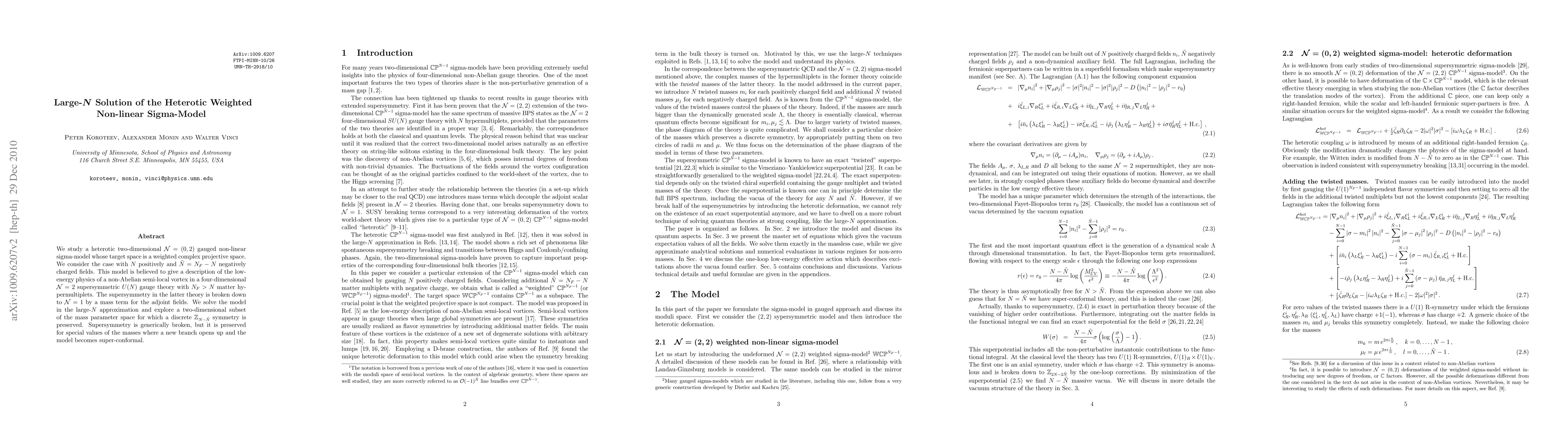 This paper investigates a heterotic sigma-model on weighted complex projective space, solving it in the large-N limit. It explores the low-energy physics of a non-Abelian semi-local vortex in a four-dimensional supersymmetric gauge theory, revealing discrete symmetry preservation and super-conformal behavior under specific mass conditions.