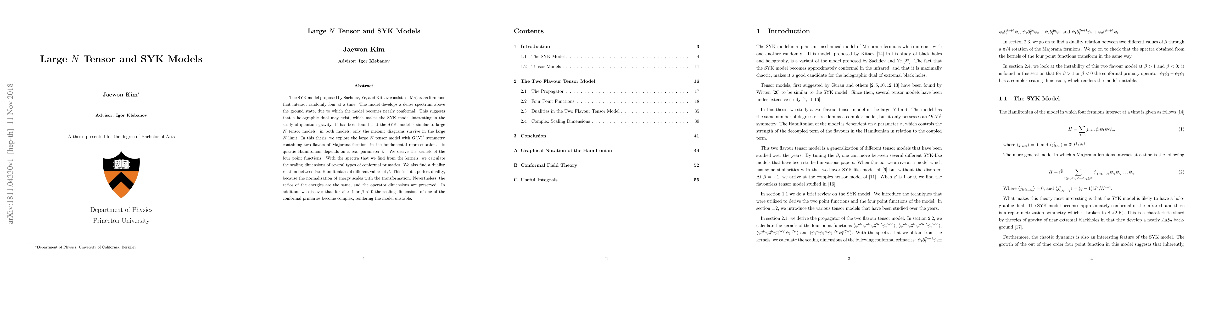 The SYK model proposed by Sachdev, Ye, and Kitaev consists of Majorana fermions that interact randomly four at a time. The model develops a dense spectrum above the ground state, due to which the model becomes nearly conformal. This suggests that a holographic dual may exist, which makes the SYK model interesting in the study of quantum gravity. It has been found that the SYK model is similar to large $N$ tensor models: in both models, only the melonic diagrams survive in the large $N$ limit. In this thesis, we explore the large $N$ tensor model with $O(N)^3$ symmetry containing two flavors of Majorana fermions in the fundamental representation. Its quartic Hamiltonian depends on a real parameter $\beta$. We derive the kernels of the four point functions. With the spectra that we find from the kernels, we calculate the scaling dimensions of several types of conformal primaries. We also find a duality relation between two Hamiltonians of different values of $\beta$. This is not a perfect duality, because the normalization of energy scales with the transformation. Nevertheless, the ratios of the energies are the same, and the operator dimensions are preserved. In addition, we discover that for $\beta > 1$ or $\beta < 0$ the scaling dimensions of one of the conformal primaries become complex, rendering the model unstable.