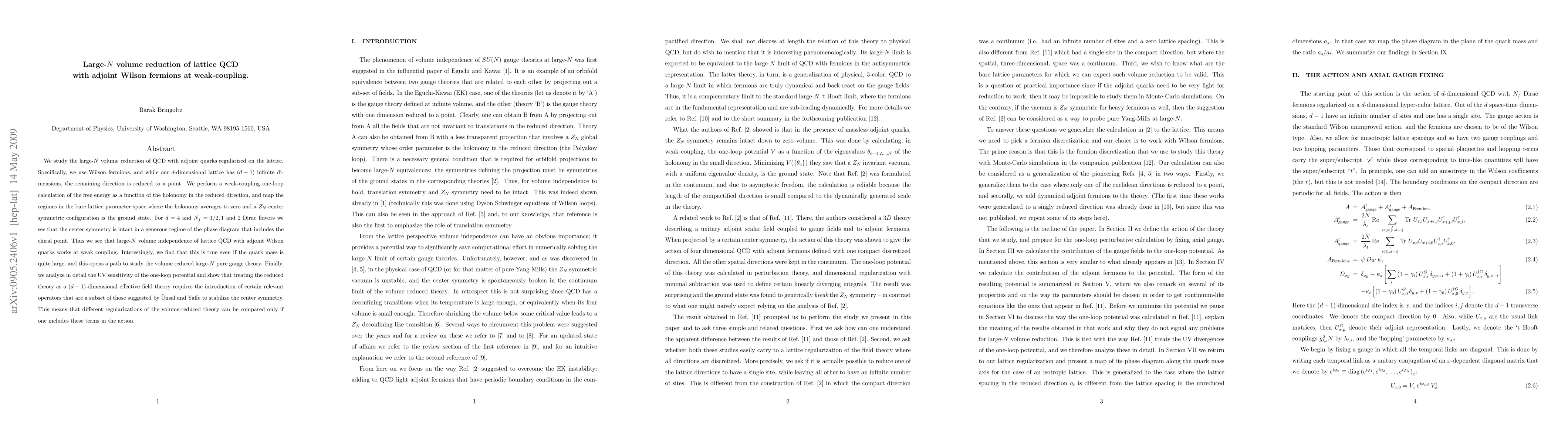 This paper investigates the large-N volume reduction of lattice QCD using adjoint Wilson fermions, demonstrating that the center symmetry remains intact even with large quark masses. It finds that the reduced theory can be treated as a (d-1)-dimensional effective field theory, requiring specific relevant operators to stabilize the center symmetry.