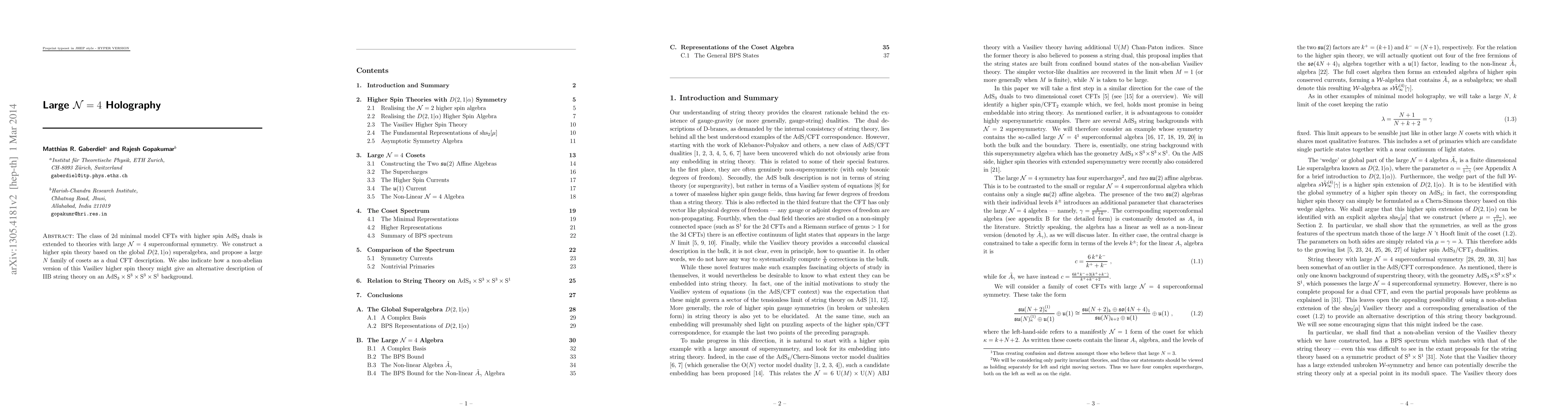 The class of 2d minimal model CFTs with higher spin AdS3 duals is extended to theories with large N=4 superconformal symmetry. We construct a higher spin theory based on the global D(2,1|alpha) superalgebra, and propose a large N family of cosets as a dual CFT description. We also indicate how a non-abelian version of this Vasiliev higher spin theory might give an alternative description of IIB string theory on an AdS3 x S3 x S3 x S1 background.