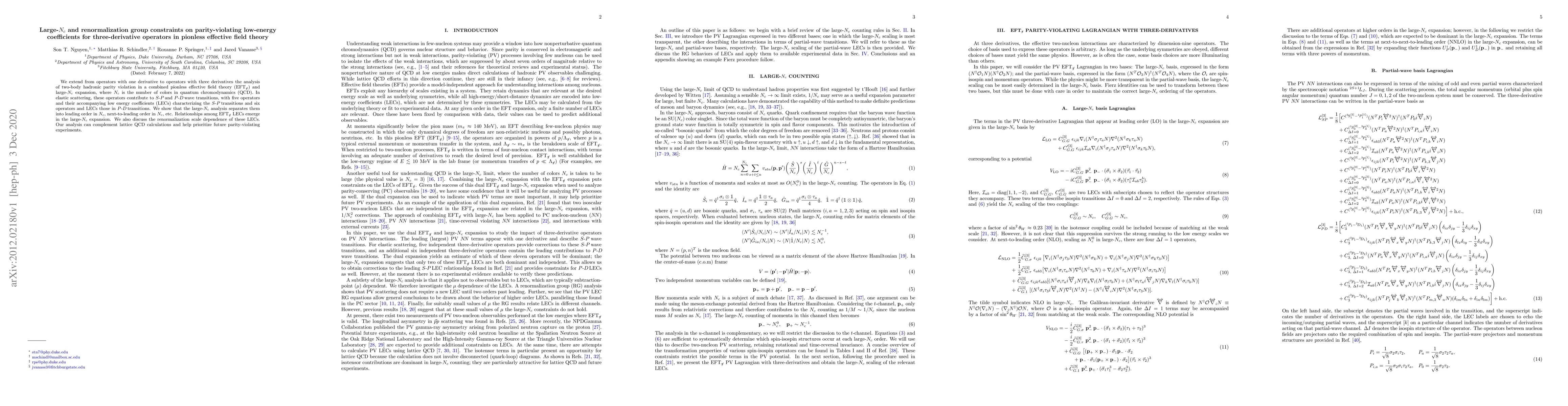 This paper extends the study of parity-violating two-body interactions in pionless effective field theory using a large-$N_c$ expansion, focusing on three-derivative operators. It identifies relationships among low-energy coefficients and discusses their renormalization scale dependence, aiming to complement lattice QCD and guide future experiments.