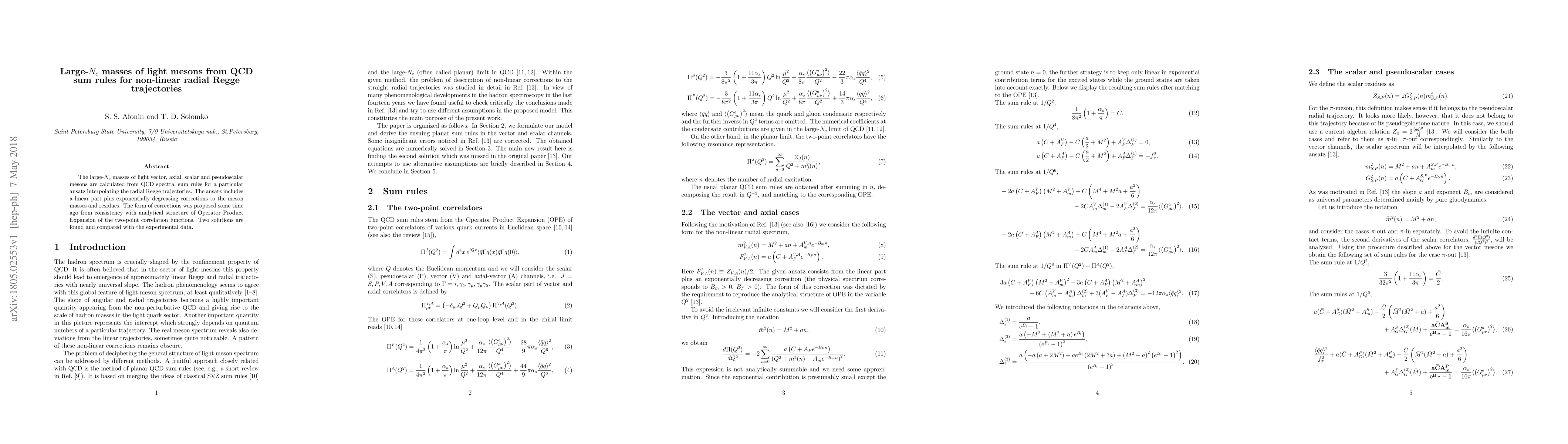 This paper calculates the large-$N_c$ masses of light mesons using QCD sum rules and a non-linear radial Regge trajectory model, incorporating linear and exponentially decreasing corrections. Two solutions are derived and compared with experimental data.