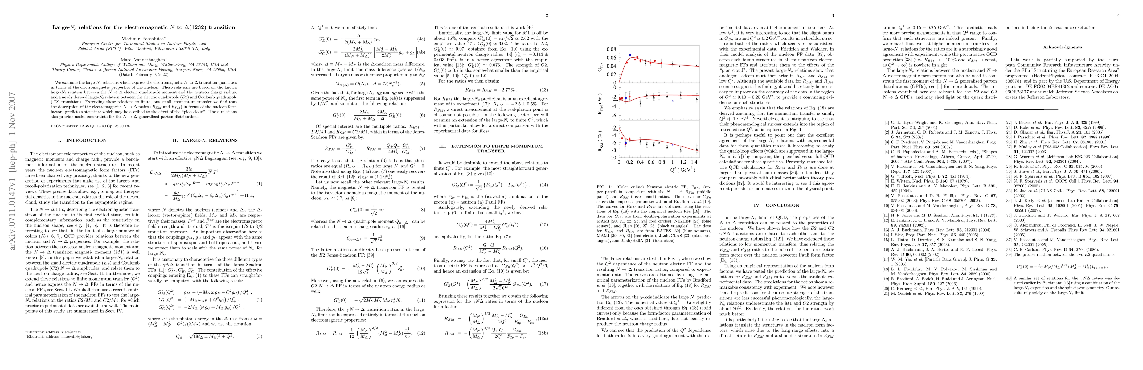 This paper explores large-$N_c$ relations for electromagnetic $N$ to $\Delta$ transition quantities, deriving new relations between electric and Coulomb quadrupole transitions. It finds that these relations predict a "pion cloud" effect and provide constraints on $N \to \Delta$ generalized parton distributions.
