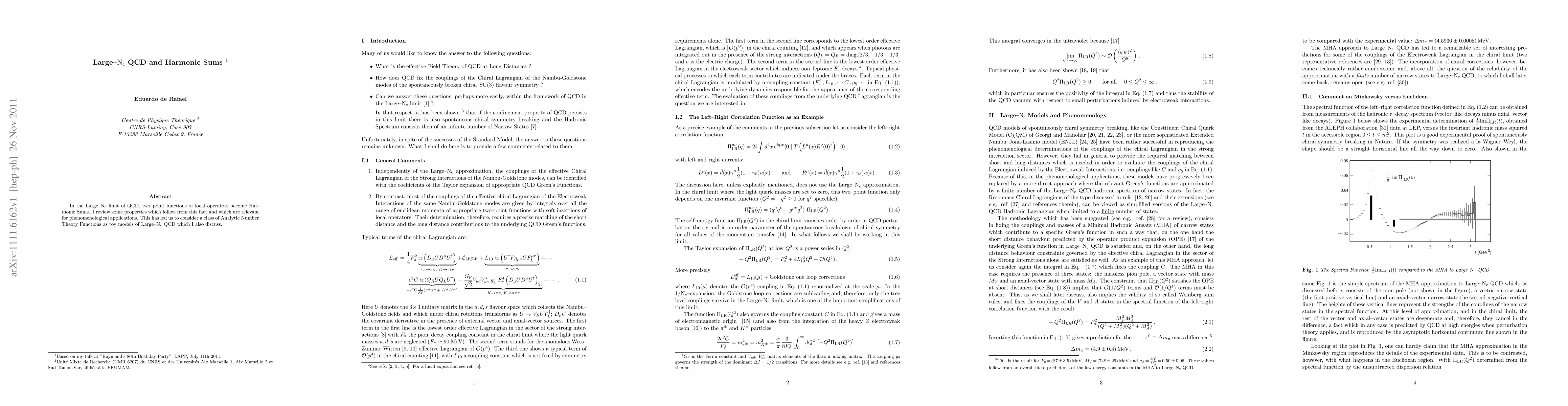 In the Large-Nc limit of QCD, two--point functions of local operators become Harmonic Sums. I review some properties which follow from this fact and which are relevant for phenomenological applications. This has led us to consider a class of Analytic Number Theory Functions as toy models of Large-Nc QCD which I also discuss.