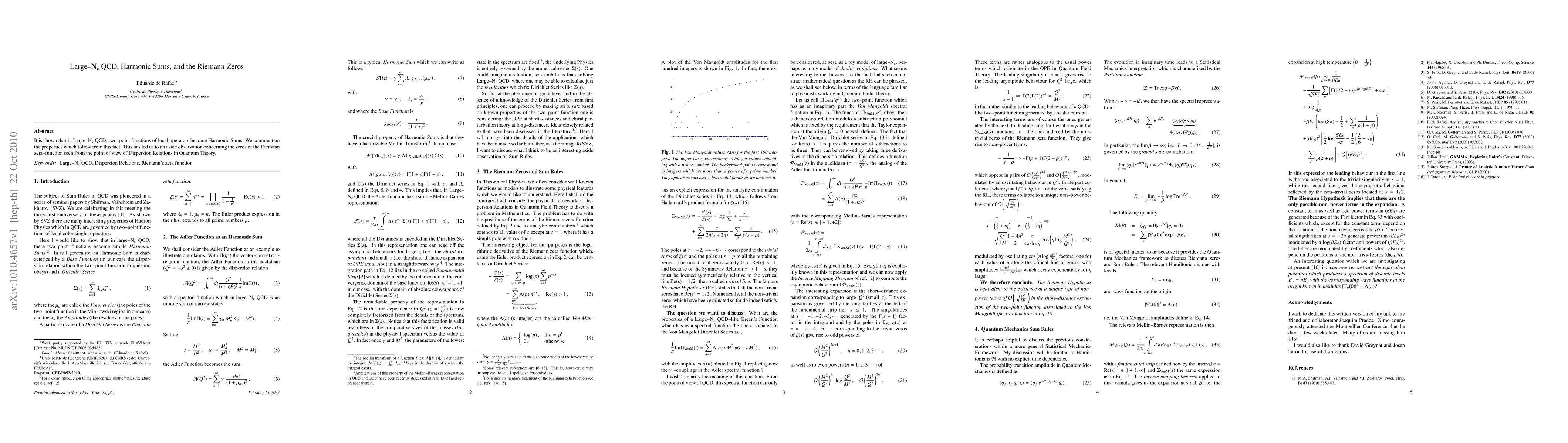 Summary: The paper demonstrates that in Large-Nc QCD, the two-point functions of local operators correspond to Harmonic Sums, and discusses the implications of this correspondence. Additionally, it explores a connection between the properties of Harmonic Sums and the zeros of the Riemann zeta-function through the lens of Dispersion Relations in Quantum Theory.