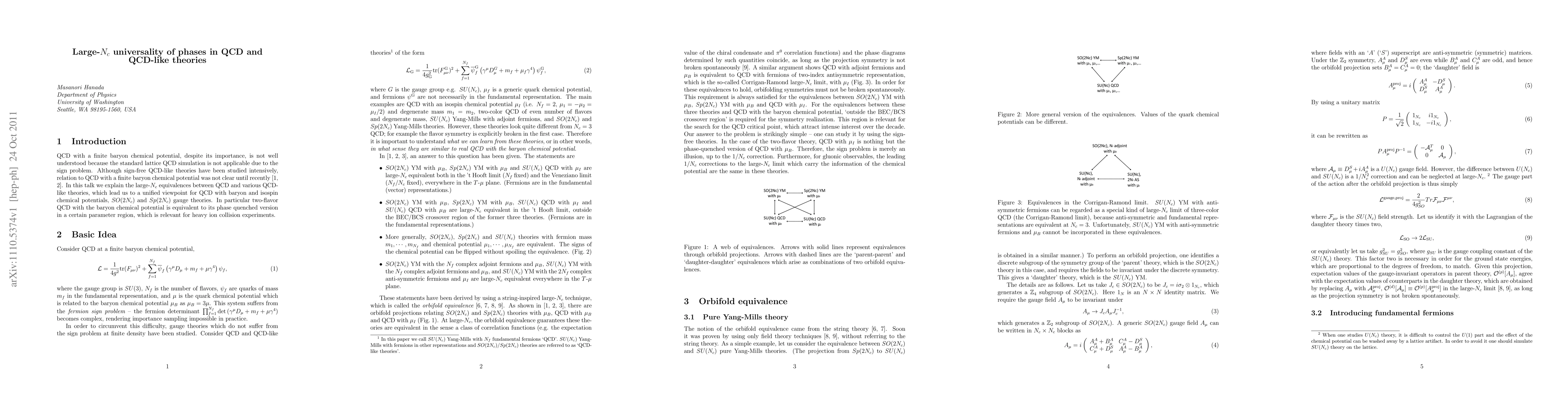 QCD with a finite baryon chemical potential, despite its importance, is not well understood because the standard lattice QCD simulation is not applicable due to the sign problem. Although sign-free QCD-like theories have been studied intensively, relation to QCD with a finite baryon chemical potential was not clear until recently. In this talk we explain the large-Nc equivalences between QCD and various QCD-like theories, which lead us to a unified viewpoint for QCD with baryon and isospin chemical potentials, SO(2Nc) and Sp(2Nc) gauge theories. In particular two-flavor QCD with the baryon chemical potential is equivalent to its phase quenched version in a certain parameter region, which is relevant for heavy ion collision experiments.