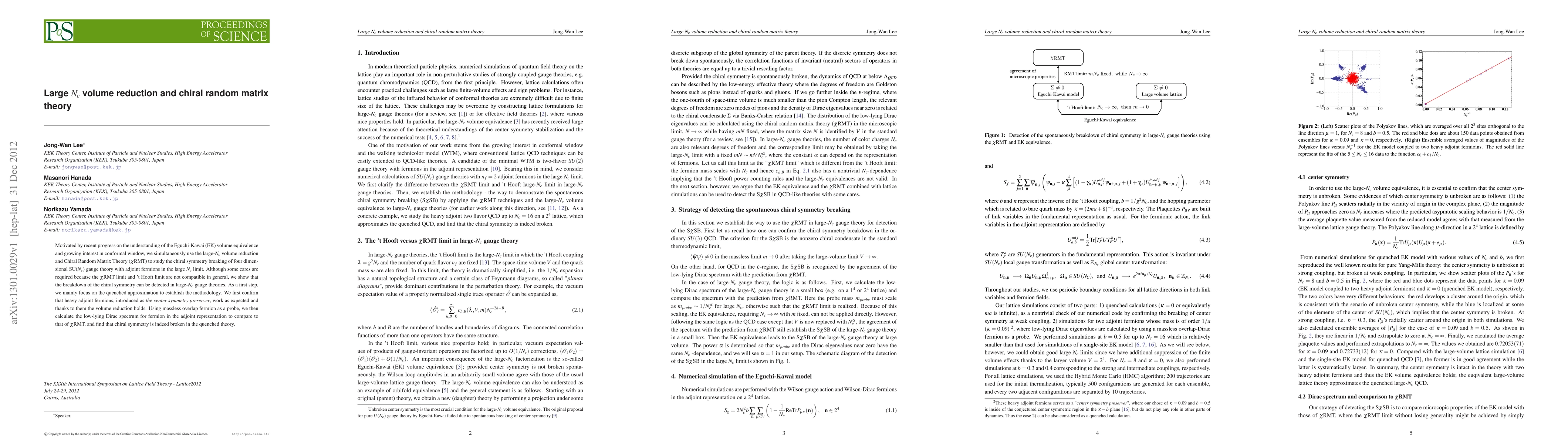 Motivated by recent progress on the understanding of the Eguchi-Kawai (EK) volume equivalence and growing interest in conformal window, we simultaneously use the large-Nc volume reduction and Chiral Random Matrix Theory (chRMT) to study the chiral symmetry breaking of four dimensional SU(Nc) gauge theory with adjoint fermions in the large Nc limit. Although some cares are required because the chRMT limit and 't Hooft limit are not compatible in general, we show that the breakdown of the chiral symmetry can be detected in large-Nc gauge theories. As a first step, we mainly focus on the quenched approximation to establish the methodology. We first confirm that heavy adjoint fermions, introduced as the center symmetry preserver, work as expected and thanks to them the volume reduction holds. Using massless overlap fermion as a probe, we then calculate the low-lying Dirac spectrum for fermion in the adjoint representation to compare to that of chRMT, and find that chiral symmetry is indeed broken in the quenched theory.