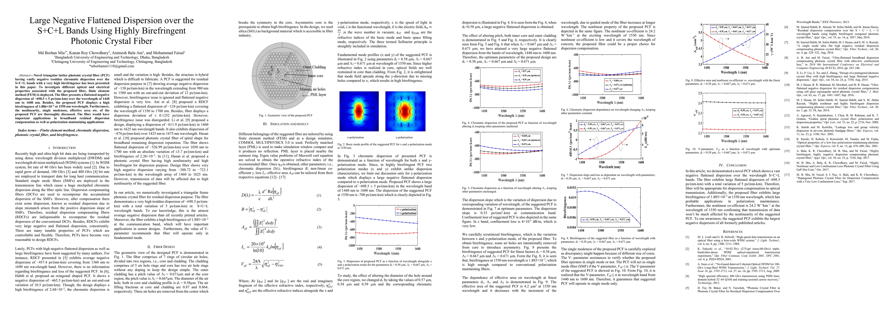 Novel triangular lattice photonic crystal fiber with a very large negative flattened dispersion over the S+C+L band, and very high birefringence is offered here. To investigate different optical properties of the proposed fiber, finite element method (FEM) is deployed. The fiber presents a flattened negative dispersion of $-698.5\pm 5 ps/(nm-km)$ over the wavelength of $1440 nm$ to $1600 nm$. Besides, the proposed photonic crystal fiber (PCF) exhibits a high birefringence of $1.886\times10^{-2}$ at the wavelength of $1550 nm$. Furthermore, the nonlinearity, single modeness, effective area etc. of the proposed PCF are thoroughly discussed. The fiber would have important applications in broadband residual dispersion compensation as well as polarization maintaining applications.