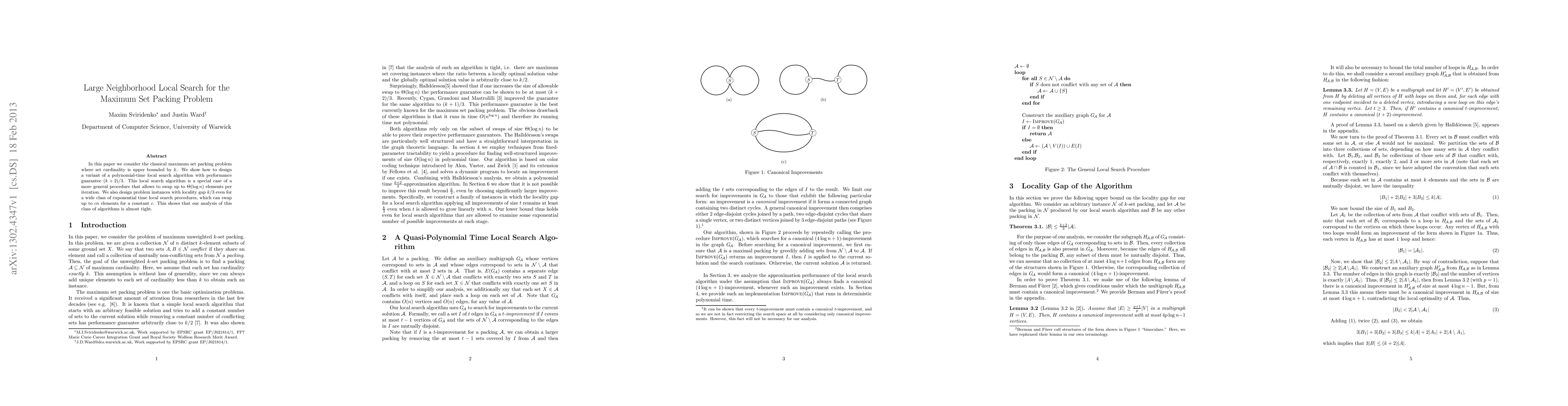 The paper introduces a novel local search algorithm for maximum set packing with improved performance guarantees and a general procedure for efficient neighborhood exploration.