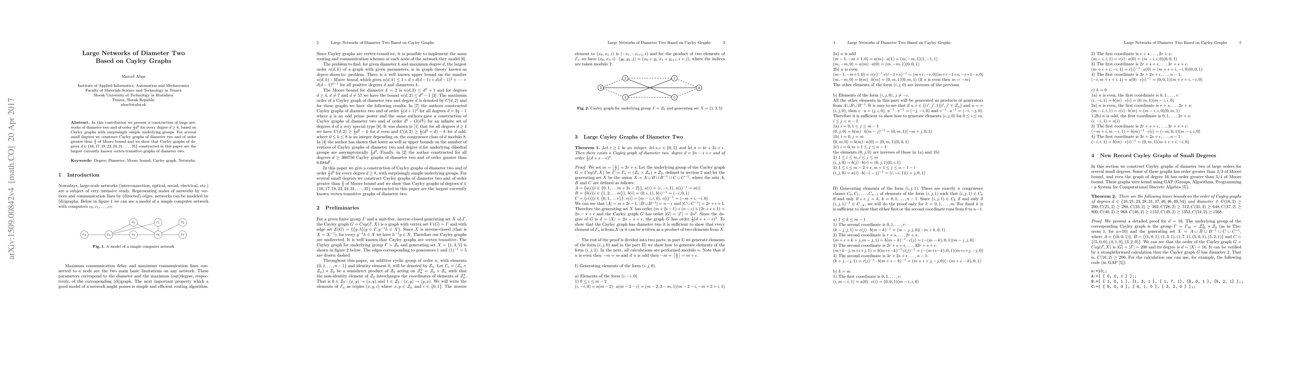 In this contribution we present a construction of large networks of diameter two and of order $\frac{1}{2}d^2$ for every degree $d\geq 8$, based on Cayley graphs with surprisingly simple underlying groups. For several small degrees we construct Cayley graphs of diameter two and of order greater than $\frac23$ of Moore bound and we show that Cayley graphs of degrees $d\in\{16,17,18,23,24,31,\dots,35\}$ constructed in this paper are the largest currently known vertex-transitive graphs of diameter two.