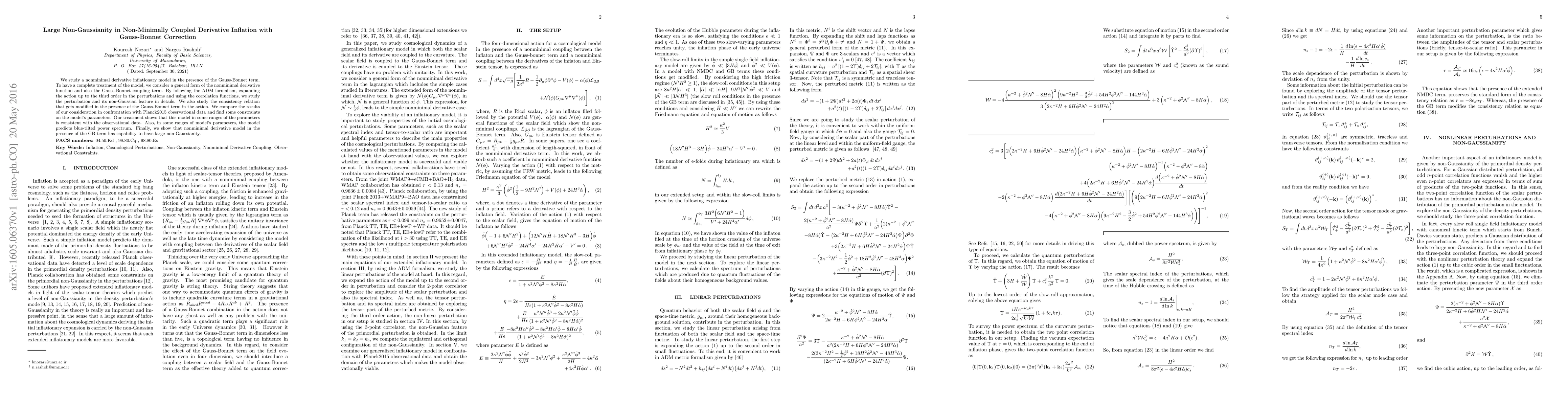 This paper investigates a non-minimal derivative inflationary model with a Gauss-Bonnet correction, finding that it can exhibit large non-Gaussianity and a blue-tilted power spectrum in certain parameter ranges. The model is consistent with Planck2015 observational data and modifies consistency relations due to the Gauss-Bonnet term.