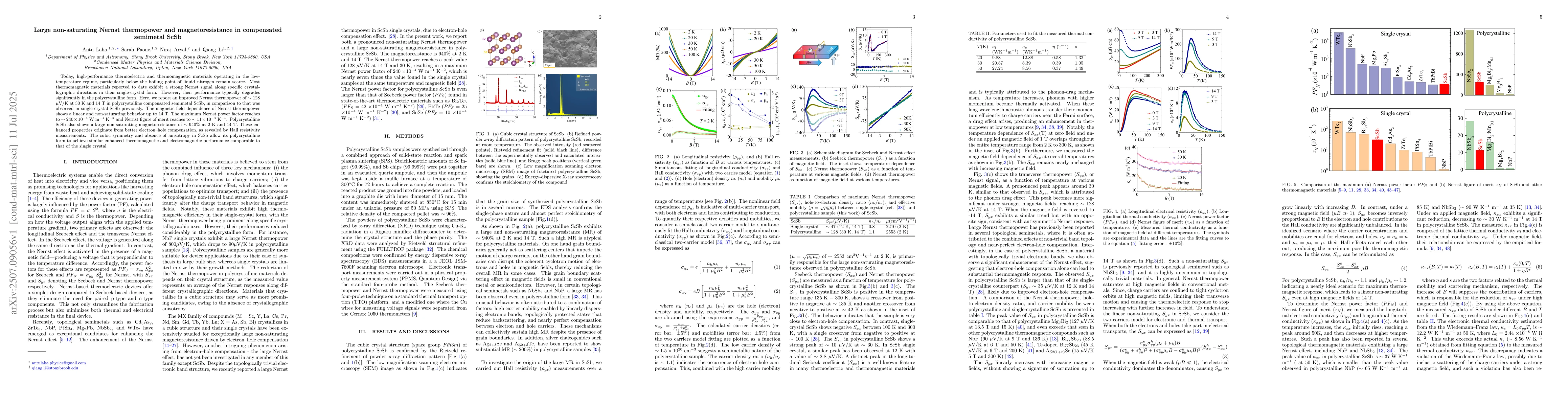 Today, high-performance thermoelectric and thermomagnetic materials operating in the low-temperature regime, particularly below the boiling point of liquid nitrogen remain scarce. Most thermomagnetic materials reported to date exhibit a strong Nernst signal along specific crystallographic directions in their single-crystal form. However, their performance typically degrades significantly in the polycrystalline form. Here, we report an improved Nernst thermopower of $\sim$ 128 $\mu$V/K at 30 K and 14 T in polycrystalline compensated semimetal ScSb, in comparison to that was observed in single crystal ScSb previously. The magnetic field dependence of Nernst thermopower shows a linear and non-saturating behavior up to 14 T. The maximum Nernst power factor reaches to $\sim 240 \times 10^{-4}$ W m$^{-1}$ K$^{-2}$ and Nernst figure of merit reaches to $\sim 11 \times 10^{-4}$ K$^{-1}$. Polycrystalline ScSb also shows a large non-saturating magnetoresistance of $\sim 940 \%$ at 2 K and 14 T. These enhanced properties originate from better electron-hole compensation, as revealed by Hall resistivity measurements. The cubic symmetry and absence of anisotropy in ScSb allow its polycrystalline form to achieve similar enhanced thermomagnetic and electromagnetic performance comparable to that of the single crystal.