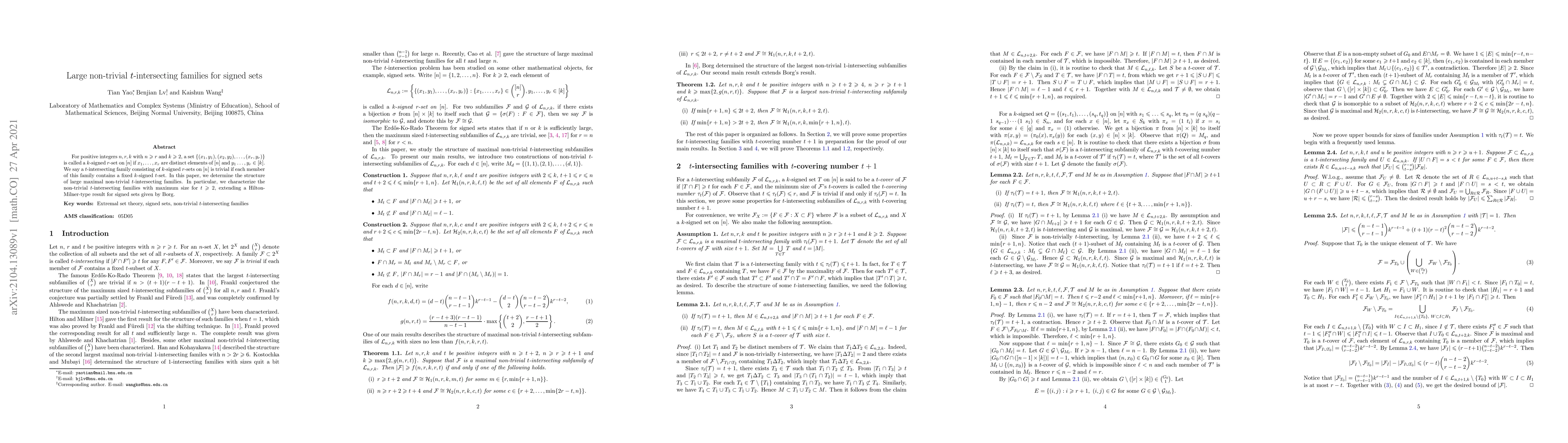For positive integers $n,r,k$ with $n\ge r$ and $k\ge2$, a set $\{(x_1,y_1),(x_2,y_2),\dots,(x_r,y_r)\}$ is called a $k$-signed $r$-set on $[n]$ if $x_1,\dots,x_r$ are distinct elements of $[n]$ and $y_1\dots,y_r\in[k]$. We say a $t$-intersecting family consisting of $k$-signed $r$-sets on $[n]$ is trivial if each member of this family contains a fixed $k$-signed $t$-set. In this paper, we determine the structure of large maximal non-trivial $t$-intersecting families. In particular, we characterize the non-trivial $t$-intersecting families with maximum size for $t\ge2$, extending a Hilton-Milner-type result for signed sets given by Borg.