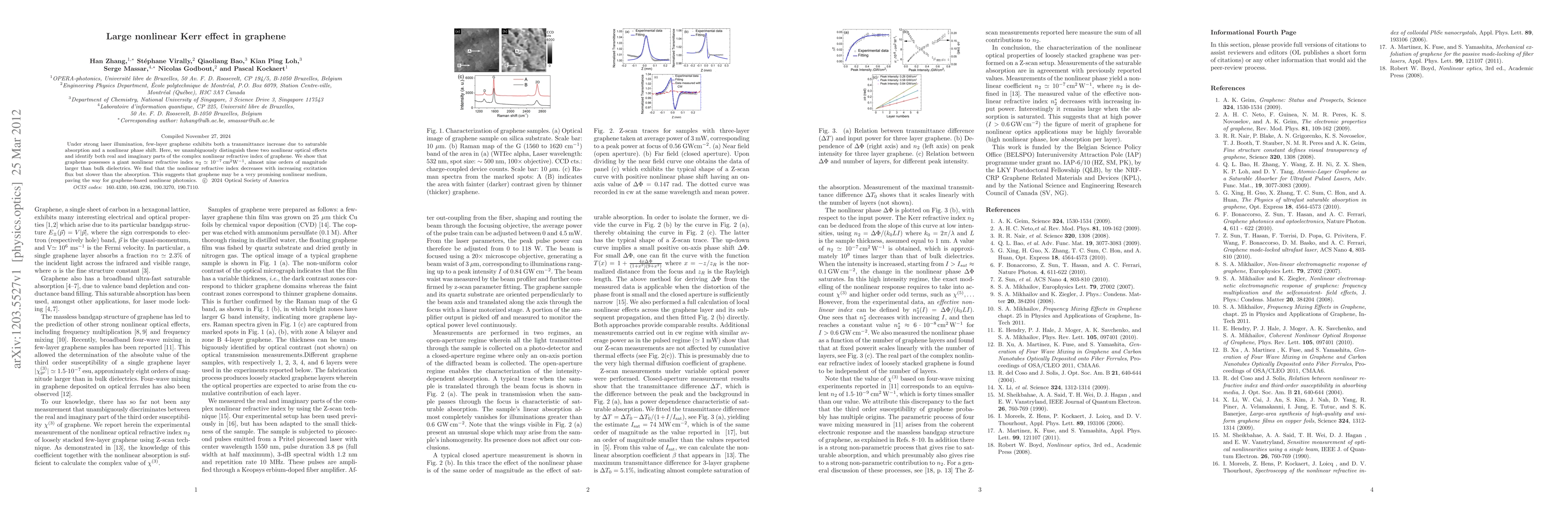 This paper investigates the large nonlinear Kerr effect in few-layer graphene under strong laser illumination, revealing a giant nonlinear refractive index n2=10-7cm2W-1, nearly nine orders of magnitude greater than bulk dielectrics, indicating potential for graphene-based nonlinear photonics. The study distinguishes between saturable absorption and nonlinear phase shift, showing a nonlinear refractive index that decreases with increasing excitation flux but slower than absorption.