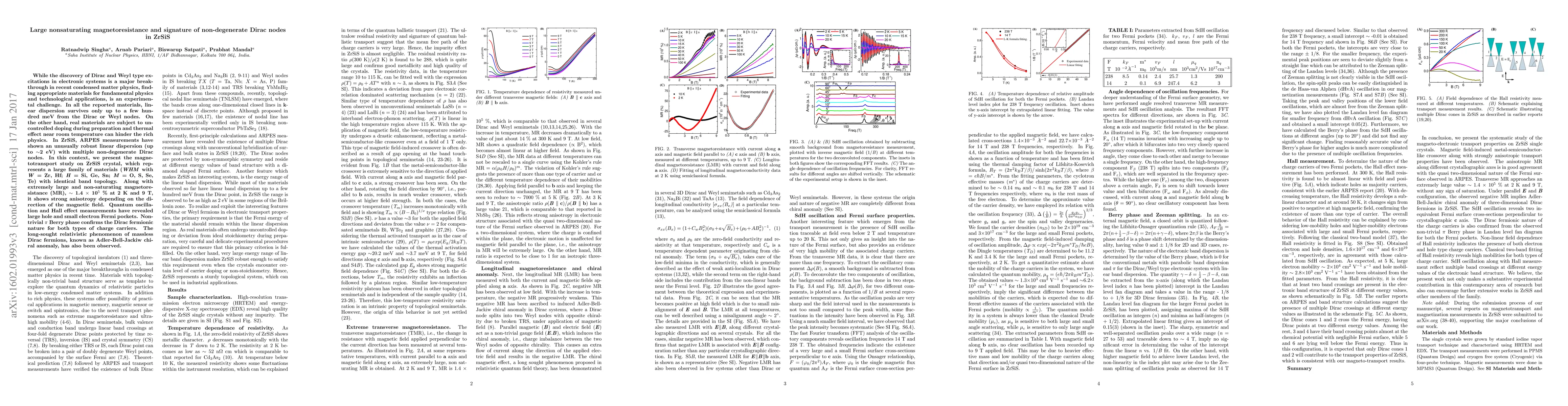 This paper reports a large nonsaturating magnetoresistance in the material ZrSiS, revealing multiple non-degenerate Dirac nodes with robust linear dispersion up to 2 eV. The study highlights the Adler-Bell-Jackiw chiral anomaly, confirming the Dirac fermionic nature and suggesting potential for fundamental physics and technological applications.