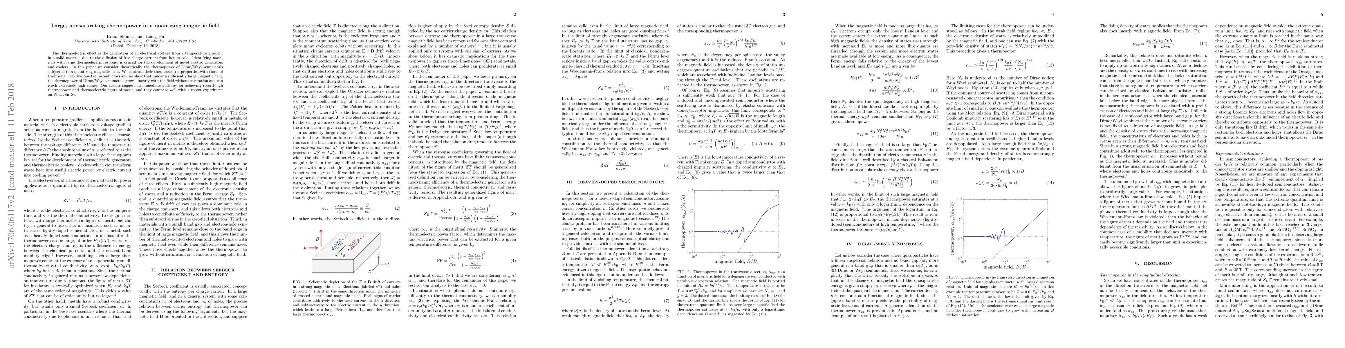 This paper theoretically investigates the thermopower of Dirac/Weyl semimetals under a quantizing magnetic field, revealing a large, nonsaturating thermopower that can reach extremely high values, contrasting with traditional semiconductors. The findings suggest a promising route for developing advanced thermoelectric materials.