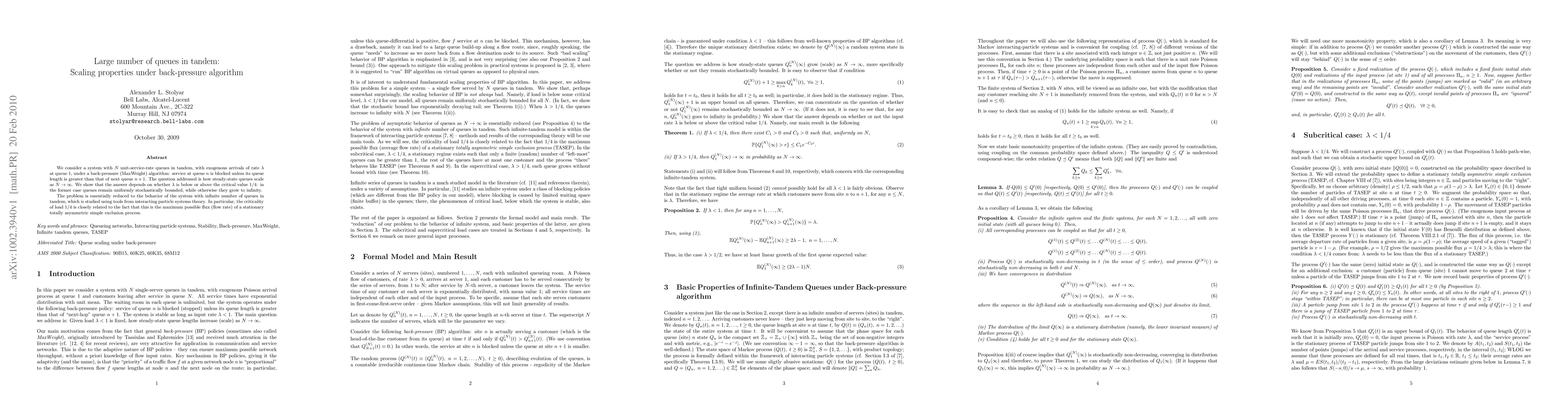 The paper establishes a connection between the back-pressure algorithm in queueing theory and interacting particle systems, providing insights into the scaling properties of large tandem queues.