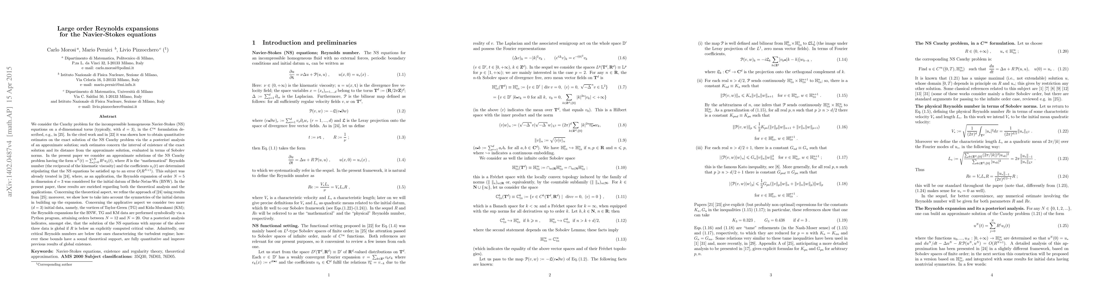 We consider the Cauchy problem for the incompressible homogeneous Navier-Stokes (NS) equations on a d-dimensional torus, in the C^infinity formulation described, e.g., in [25]. In [22][25] it was shown how to obtain quantitative estimates on the exact solution of the NS Cauchy problem via the "a posteriori" analysis of an approximate solution; such estimates concern the interval of existence of the exact solution and its distance from the approximate solution. In the present paper we consider an approximate solutions of the NS Cauchy problem having the form u^N(t) = sum_{j=0}^N R^j u_j(t), where R is the "mathematical" Reynolds number (the reciprocal of the kinematic viscosity) and the coefficients u_j(t) are determined stipulating that the NS equations be satisfied up to an error O(R^{N+1}). This subject was already treated in [24], where, as an application, the Reynolds expansion of order N=5 in dimension d=3 was considered for the initial datum of Behr-Necas-Wu (BNW). In the present paper, these results are enriched regarding both the theoretical analysis and the applications. Concerning the theoretical aspect, we refine the approach of [24] following [25] and use the symmetries of the initial datum in building up the expansion. Concerning the applicative aspect we consider two more (d=3) initial data, namely, the vortices of Taylor-Green (TG) and Kida-Murakami (KM); the Reynolds expansions for the BNW, TG and KM data are performed via a Python program, attaining orders between N=12 and N=20. Our a posteriori analysis proves, amongst else, that the solution of the NS equations with anyone of the above three data is global if R is below an explicitly computed critical value. Our critical Reynolds numbers are below the ones characterizing the turbulent regime; however these bounds have a sound theoretical support, are fully quantitative and improve previous results of global existence.