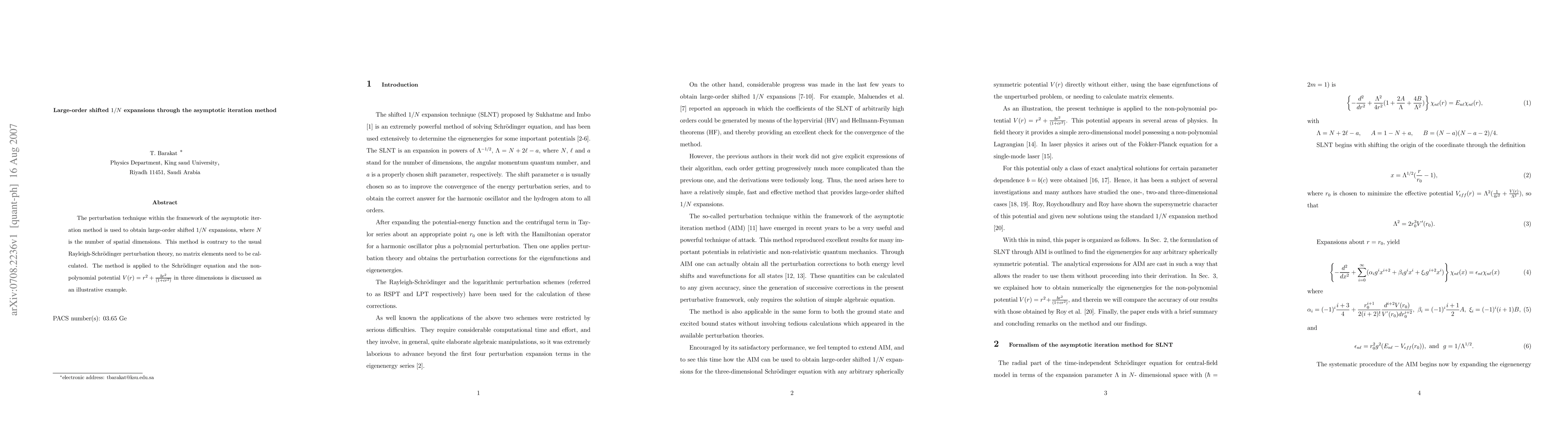 The perturbation technique within the framework of the asymptotic iteration method is used to obtain large-order shifted 1/N expansions, where N is the number of spatial dimensions. This method is contrary to the usual Rayleigh-Schr\"{o}dinger perturbation theory, no matrix elements need to be calculated. The method is applied to the Schr\"{o}dinger equation and the non-polynomial potential $V(r)=r^2+\frac{b r^2}{(1+cr^2)}$ in three dimensions is discussed as an illustrative example.
