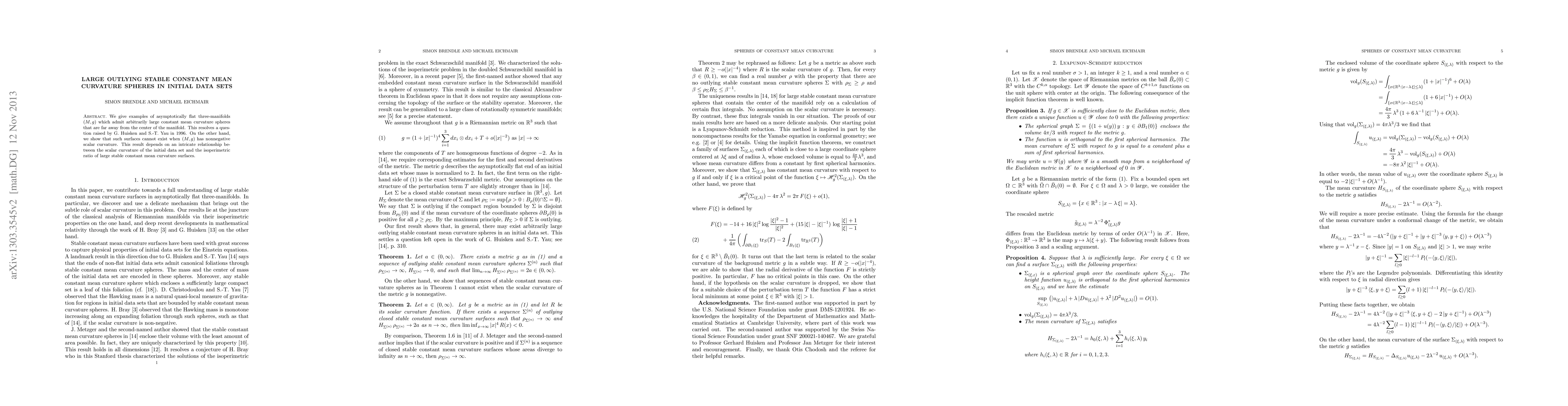 We give examples of asymptotically flat three-manifolds $(M,g)$ which admit arbitrarily large constant mean curvature spheres that are far away from the center of the manifold. This resolves a question raised by G. Huisken and S.-T. Yau in 1996. On the other hand, we show that such surfaces cannot exist when $(M,g)$ has nonnegative scalar curvature. This result depends on an intricate relationship between the scalar curvature of the initial data set and the isoperimetric ratio of large stable constant mean curvature surfaces.