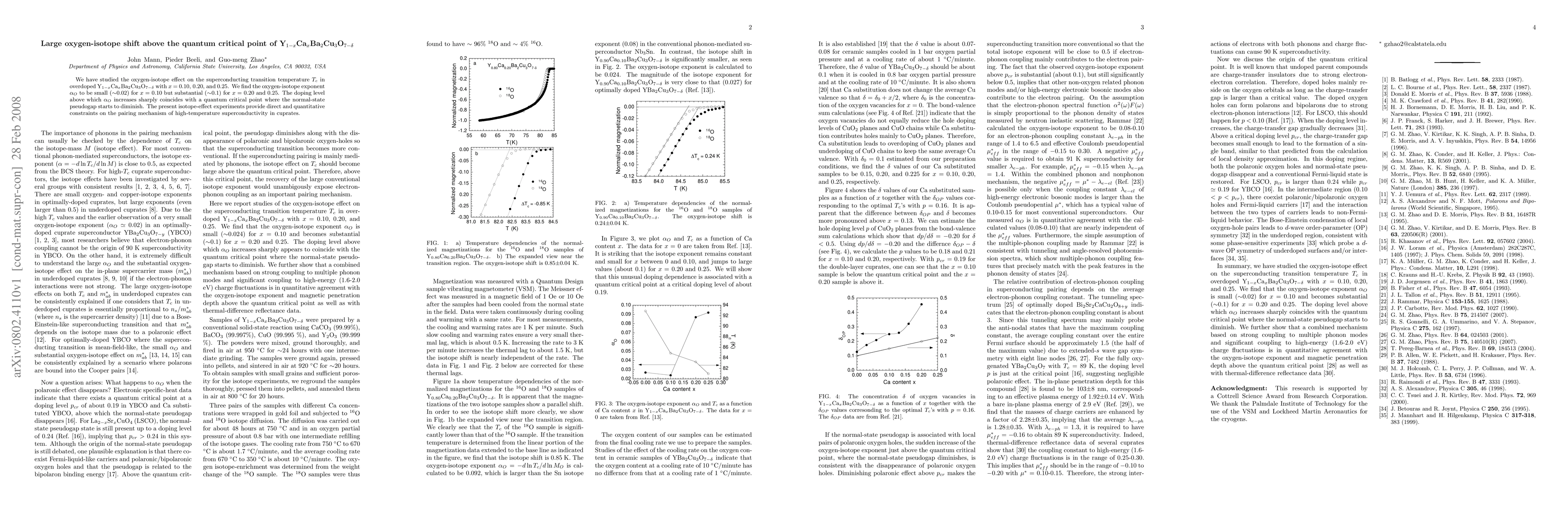 This study investigates the oxygen-isotope effect on the superconducting transition temperature in overdoped Y$_{1-x}$Ca$_{x}$Ba$_{2}$Cu$_{3}$O$_{7-\delta}$, finding a large oxygen-isotope shift above a quantum critical point where the pseudogap diminishes. The results offer insights into the pairing mechanism in high-temperature cuprate superconductivity.