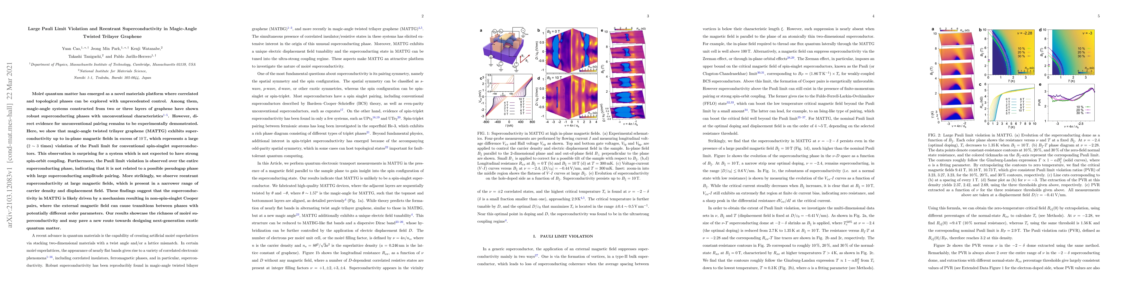 Magic-angle twisted trilayer graphene exhibits superconductivity up to 10 T magnetic fields, violating the Pauli limit 2-3 times, and shows reentrant behavior at large fields.