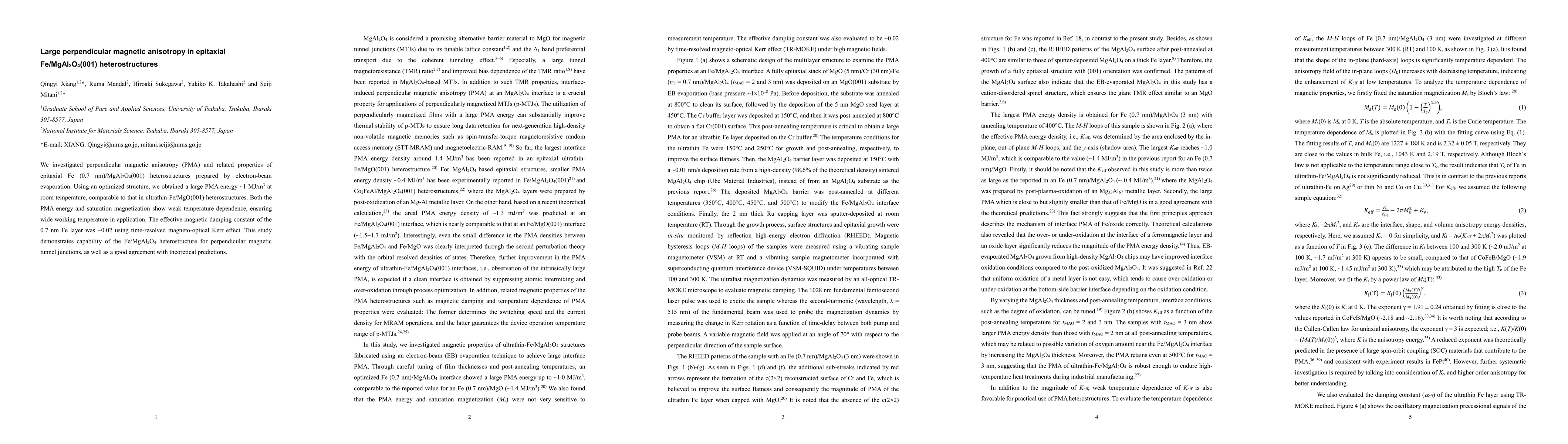 This study reports a large perpendicular magnetic anisotropy (PMA) in epitaxial Fe/MgAl2O4 heterostructures, achieving PMA energy of ~1 MJ/m³ at room temperature. The PMA and saturation magnetization exhibit weak temperature dependence, indicating suitability for a wide range of applications.