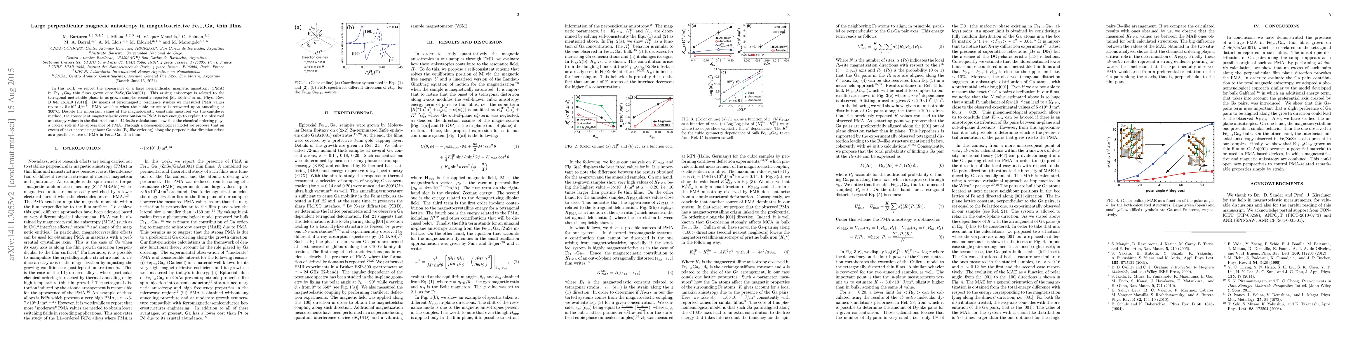 In this work we report the appearence of a large perpendicular magnetic anisotropy (PMA) in Fe$_{1-x}$Ga$_x$ thin films grown onto ZnSe/GaAs(100). This arising anisotropy is related to the tetragonal metastable phase in as-grown samples recently reported [M. Eddrief {\it et al.}, Phys. Rev. B {\bf 84}, 161410 (2011)]. By means of ferromagnetic resonance studies we measured PMA values up to $\sim$ 5$\times$10$^5$ J/m$^3$. PMA vanishes when the cubic structure is recovered upon annealing at 300$^{\circ}$C. Despite the important values of the magnetoelastic constants measured via the cantilever method, the consequent magnetoelastic contribution to PMA is not enough to explain the observed anisotropy values in the distorted state. {\it Ab initio} calculations show that the chemical ordering plays a crucial role in the appearance of PMA. Through a phenomenological model we are able to explain that an excess of next nearest neighbour Ga pairs (B$_2$-like ordering) along the perpendicular direction arises as the source of PMA in Fe$_{1-x}$Ga$_x$ thin films.