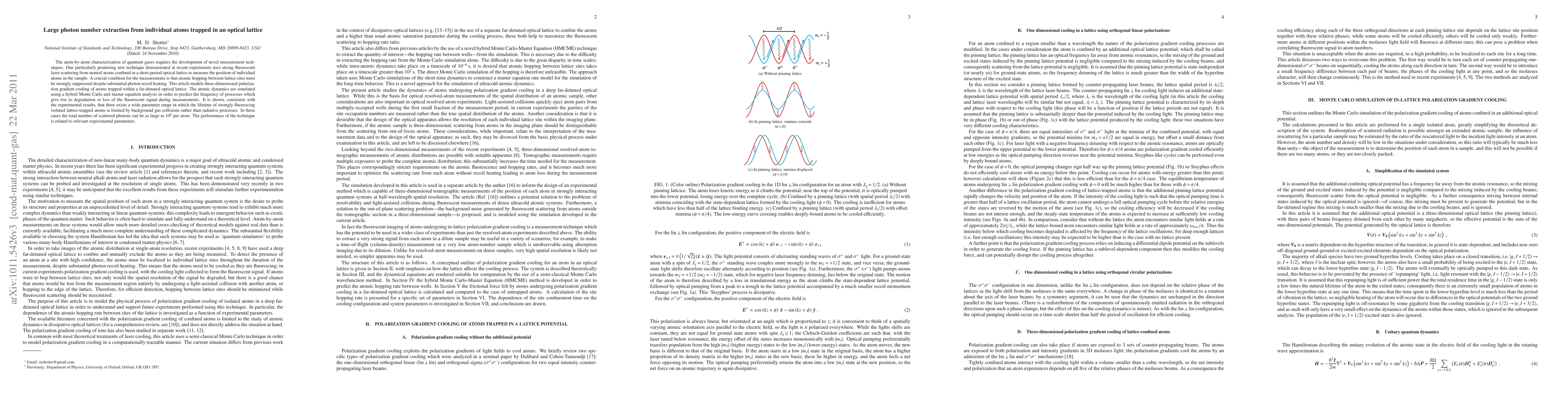 The atom-by-atom characterization of quantum gases requires the development of novel measurement techniques. One particularly promising new technique demonstrated in recent experiments uses strong fluorescent laser scattering from neutral atoms confined in a short-period optical lattice to measure the position of individual atoms in the sample. A crucial condition for the measurements is that atomic hopping between lattice sites must be strongly suppressed despite substantial photon recoil heating. This article models three-dimensional polarization gradient cooling of atoms trapped within a far-detuned optical lattice. The atomic dynamics are simulated using a hybrid Monte Carlo and master equation analysis in order to predict the frequency of processes which give rise to degradation or loss of the fluorescent signal during measurements. It is shown, consistent with the experimental results, that there exists a wide parameter range in which the lifetime of strongly-fluorescing isolated lattice-trapped atoms is limited by background gas collisions rather than radiative processes. In these cases the total number of scattered photons can be as large as 10^8 per atom. The performance of the technique is related to relevant experimental parameters.