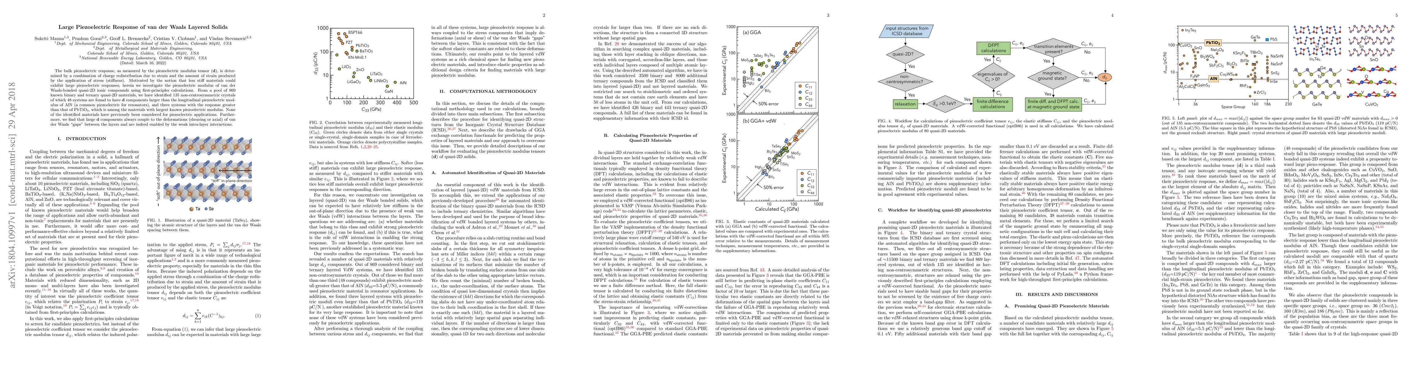 This paper identifies 135 non-centrosymmetric quasi-2D van der Waals materials with large piezoelectric responses, surpassing common piezoelectrics like AlN and PbTiO$_3$. The large piezoelectric modulus is attributed to the weak intra-layer interactions and deformations in the van der Waals gaps.
