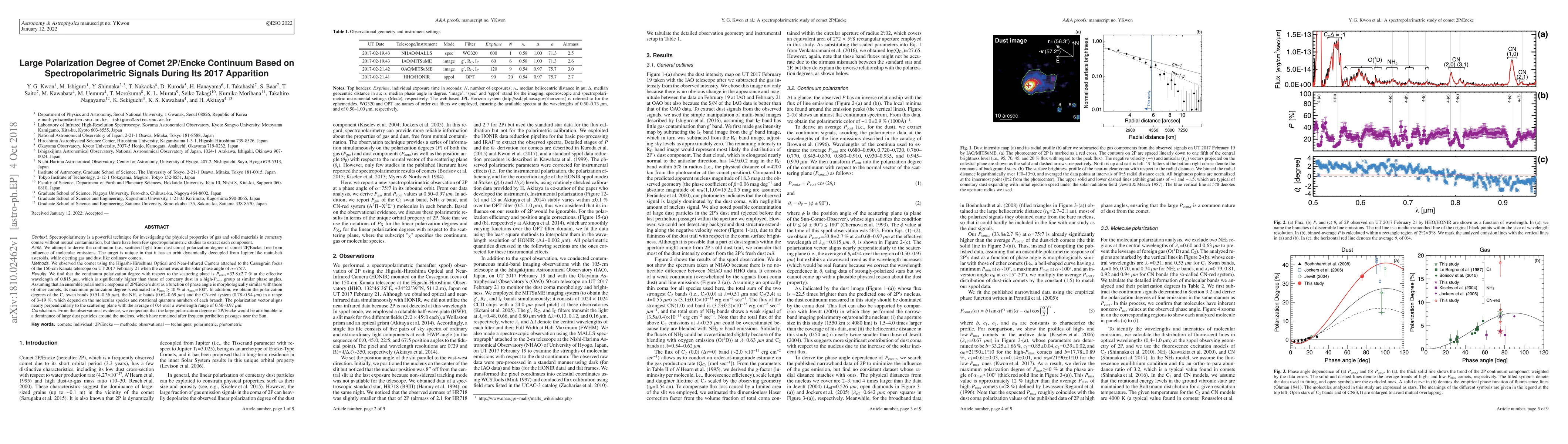 Spectropolarimetry is a powerful technique for investigating the physical properties of gas and solid materials in cometary comae without mutual contamination, but there have been few spectropolarimetric studies to extract each component. We attempt to derive the continuum polarization degree of comet 2P/Encke, free from influence of molecular emissions. The target is unique in that it has an orbit dynamically decoupled from Jupiter like main-belt asteroids, while ejecting gas and dust like ordinary comets. We observed the comet using the Higashi-Hiroshima Optical and Near-Infrared Camera attached to the Cassegrain focus of the 150-cm Kanata telescope on UT 2017 February 21 when the comet was at the solar phase angle of 75.7 deg. We find that the continuum polarization degree with respect to the scattering plane is 33.8+/-2.7 % at the effective wavelength of 0.815 um, which is significantly higher than those of cometary dust in a high-Pmax group at similar phase angles. Assuming that an ensemble polarimetric response of 2P/Encke's dust as a function of phase angle is morphologically similar with those of other comets, its maximum polarization degree is estimated to > 40 % at the phase angle of ~100 deg. In addition, we obtain the polarization degrees of the C2 swan bands (0.51-0.56 um), the NH2 alpha bands (0.62-0.69 um) and the CN-red system (0.78-0.94 um) in a range of 3-19 %, which depend on the molecular species and rotational quantum numbers of each branch. The polarization vector aligns nearly perpendicularly to the scattering plane with the average of 0.4 deg over a wavelength range of 0.50-0.97 um. From the observational evidence, we conjecture that the large polarization degree of 2P/Encke would be attributable to a dominance of large dust particles around the nucleus, which have remained after frequent perihelion passages near the Sun.