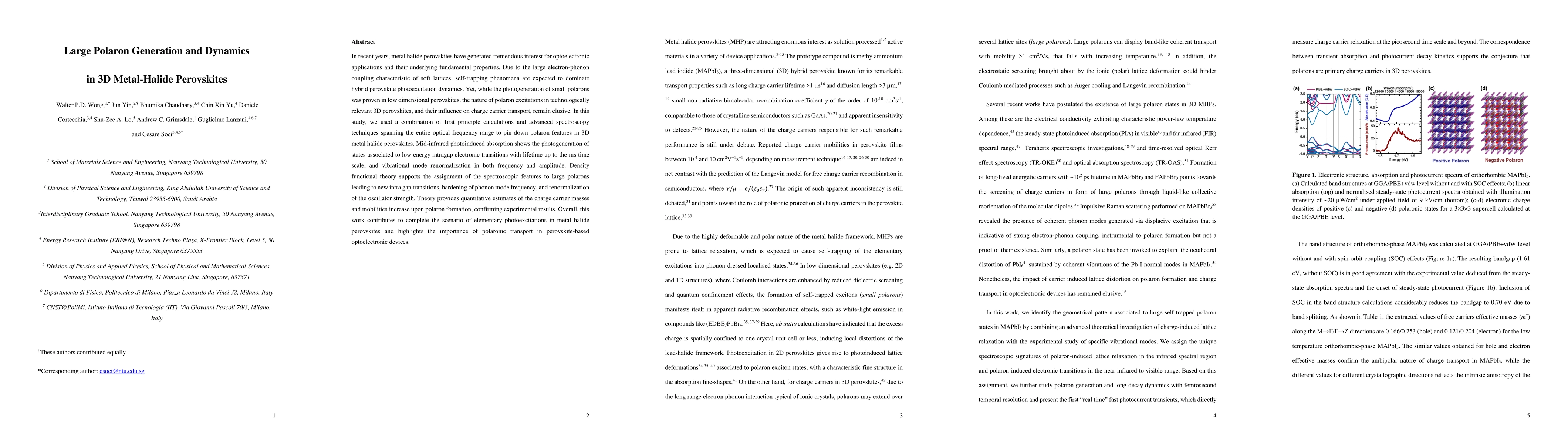 This study investigates the generation and dynamics of large polarons in 3D metal halide perovskites using first-principle calculations and advanced spectroscopy. Findings reveal the formation of large polarons through mid-infrared photoinduced absorption, affecting intragap electronic transitions and phonon modes, which enhances charge carrier transport in optoelectronic applications.
