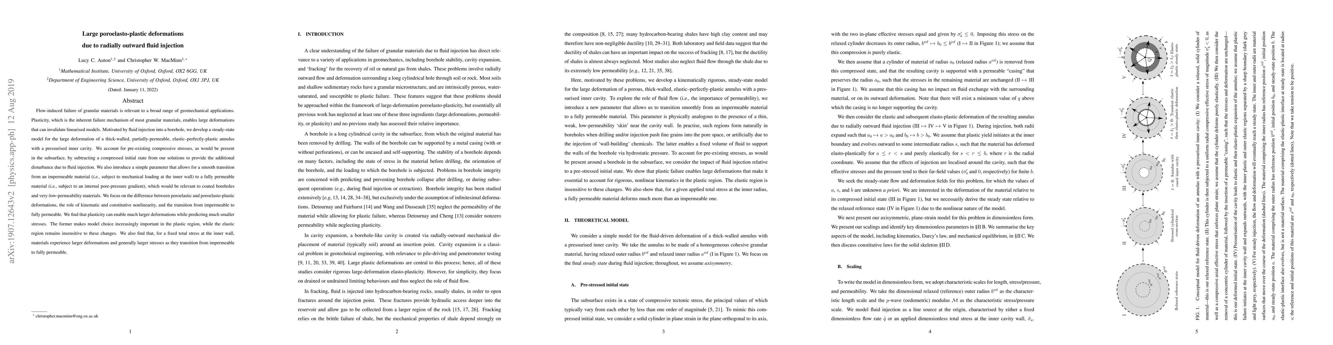 Flow-induced failure of granular materials is relevant to a broad range of geomechanical applications. Plasticity, which is the inherent failure mechanism of most granular materials, enables large deformations that can invalidate linearised models. Motivated by fluid injection into a borehole, we develop a steady-state model for the large deformation of a thick-walled, partially-permeable, elastic--perfectly-plastic annulus with a pressurised inner cavity. We account for pre-existing compressive stresses, as would be present in the subsurface, by subtracting a compressed initial state from our solutions to provide the additional disturbance due to fluid injection. We also introduce a simple parameter that allows for a smooth transition from an impermeable material (i.e., subject to mechanical loading at the inner wall) to a fully permeable material (i.e., subject to an internal pore-pressure gradient), which would be relevant to coated boreholes and very-low-permeability materials. We focus on the difference between poroelastic and poroelasto-plastic deformations, the role of kinematic and constitutive nonlinearity, and the transition from impermeable to fully permeable. We find that plasticity can enable much larger deformations while predicting much smaller stresses. The former makes model choice increasingly important in the plastic region, while the elastic region remains insensitive to these changes. We also find that, for a fixed total stress at the inner wall, materials experience larger deformations and generally larger stresses as they transition from impermeable to fully permeable.