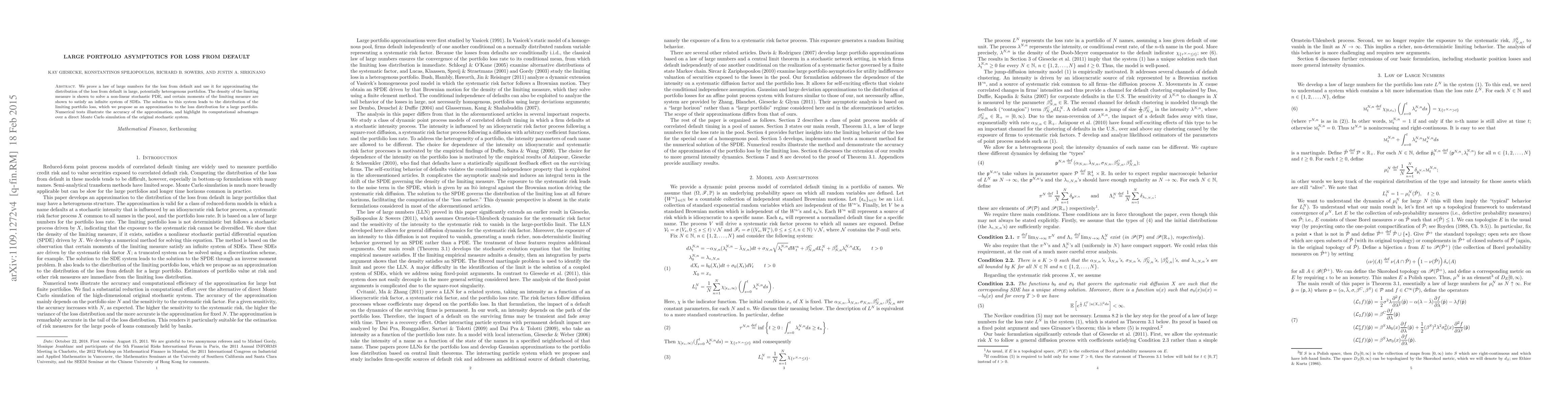 This paper establishes a law of large numbers for default losses in large portfolios, approximating the loss distribution via a non-linear SPDE solution. Numerical tests demonstrate the method's accuracy and computational efficiency compared to Monte Carlo simulations.